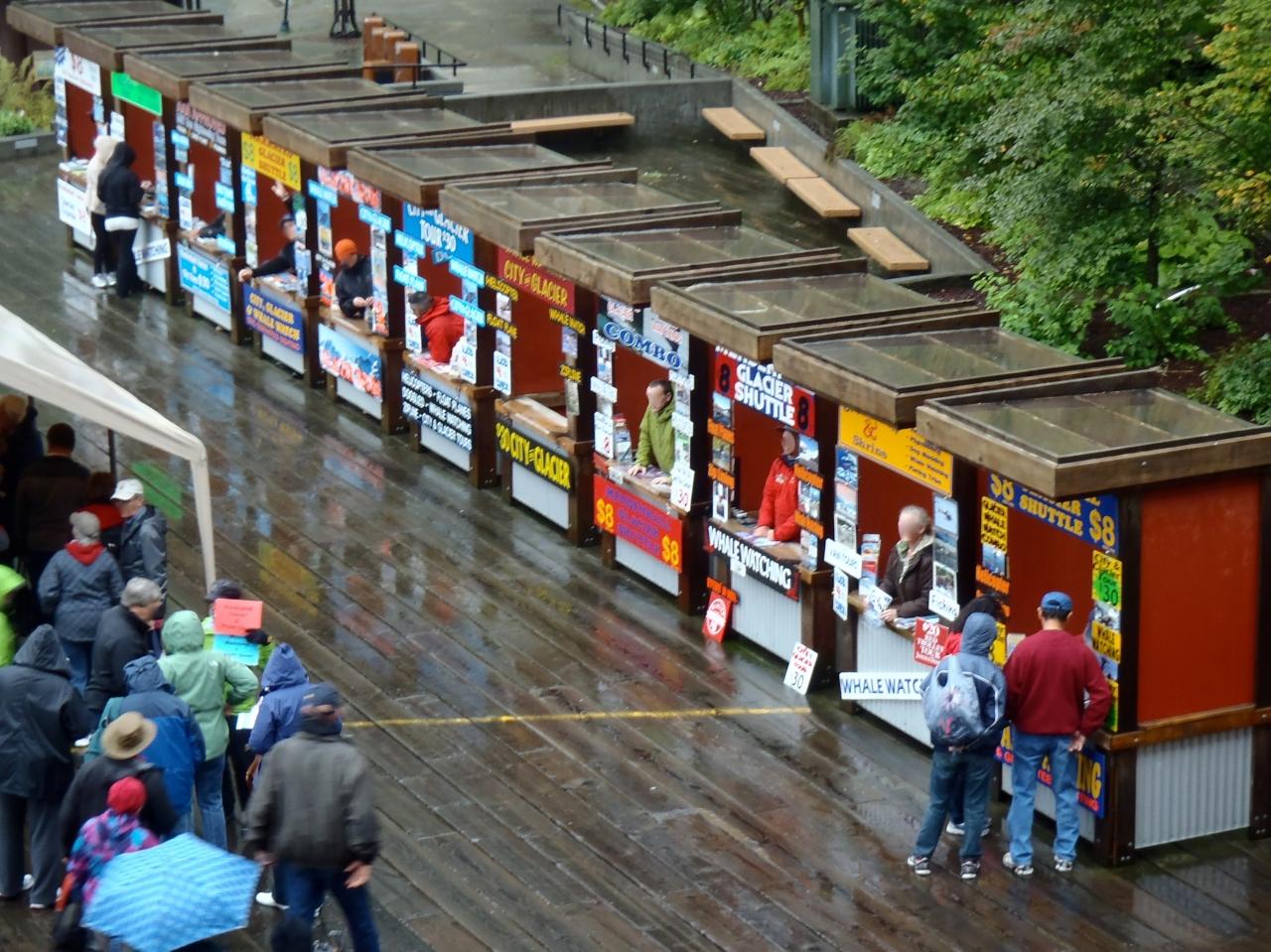 ジュノーの港近くには、氷河へ行くバスやツアーのチケット売場が並んでいる。