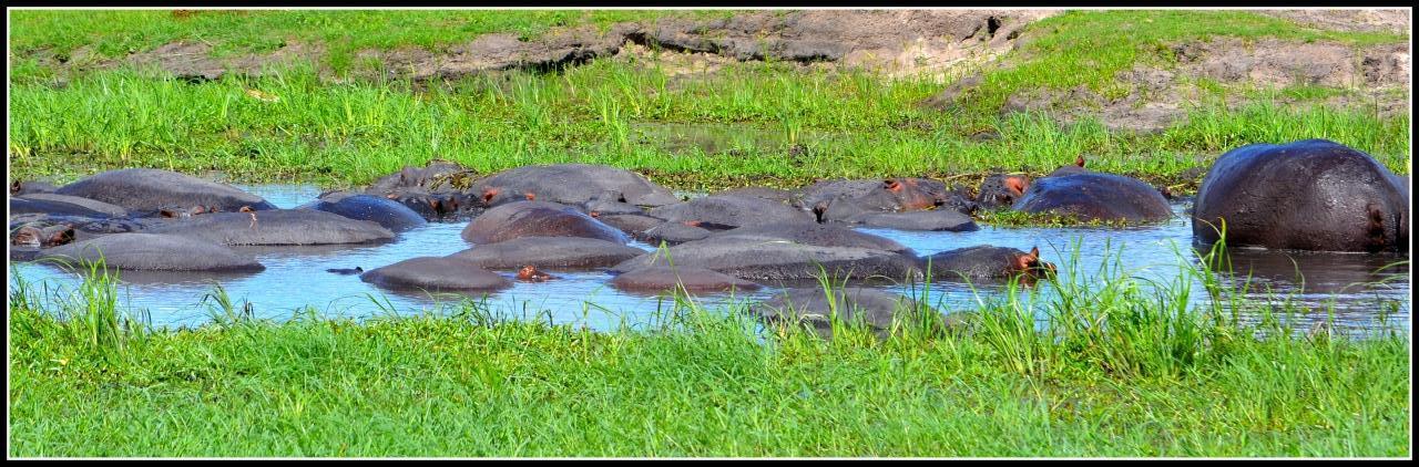 遠くにカバさん。臆病なカバが人目も憚らず、陸に上がり、草を食べまくっています。ちょうど、雨季が始まり数ヶ月。食料と水が豊富な時期なんだそーです。
