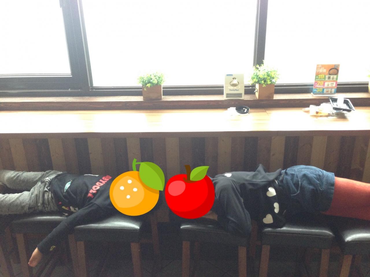 バスで撃沈した子供達を一人づつ抱っこしては身動きが取れません・・・観海亭手前にあるファミリーマートのイートインコーナーでしばし休憩させて頂き、
