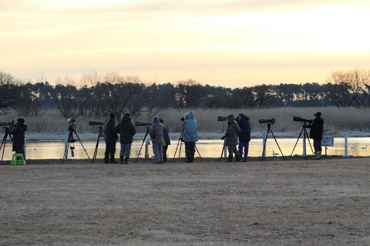 多々良沼の隣にあるガバ沼に並んでいるカメラの放列です。カメラを見てください。本格的です。白鳥の瞬間的姿を狙っているのでしょうが、皆さんすごいカメラです