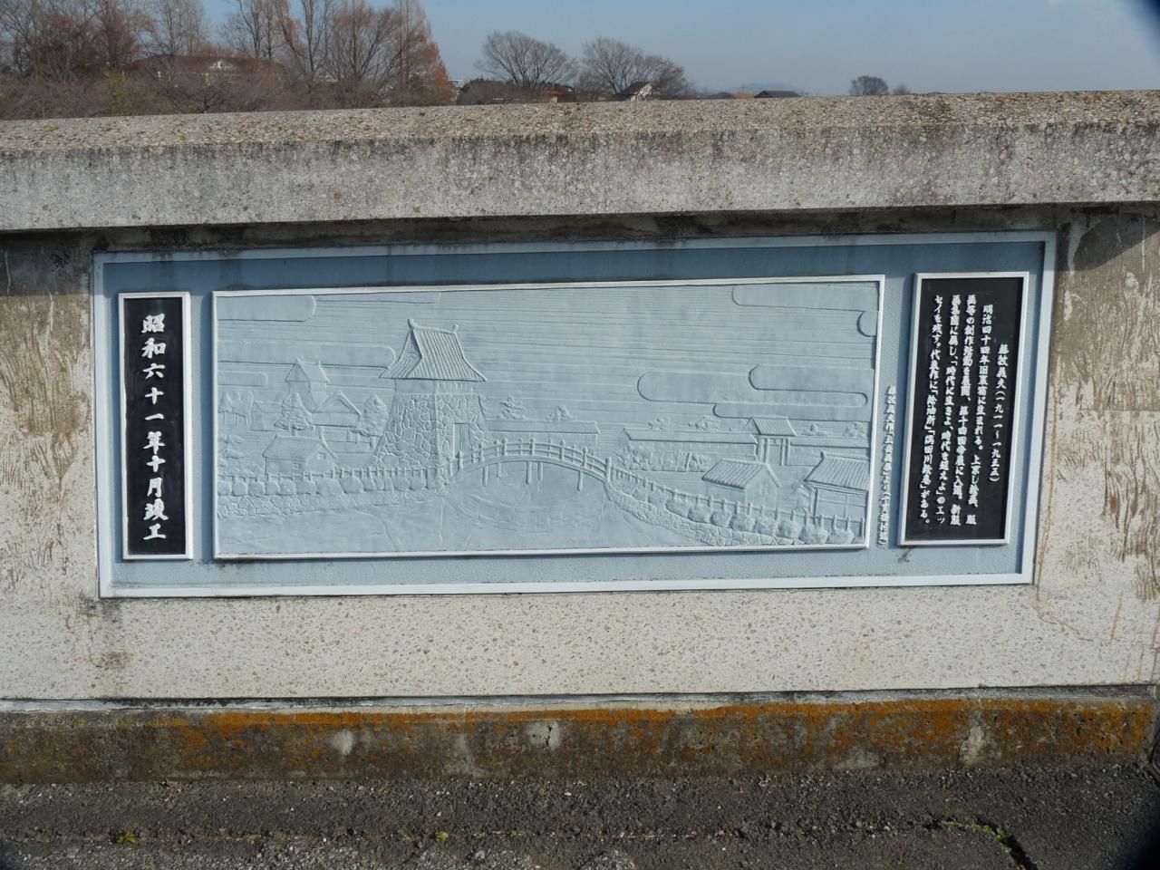 橋の北側の欄干の西端に「藤牧義夫」の版画を基にしたレリーフが飾られています。