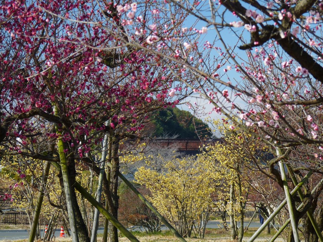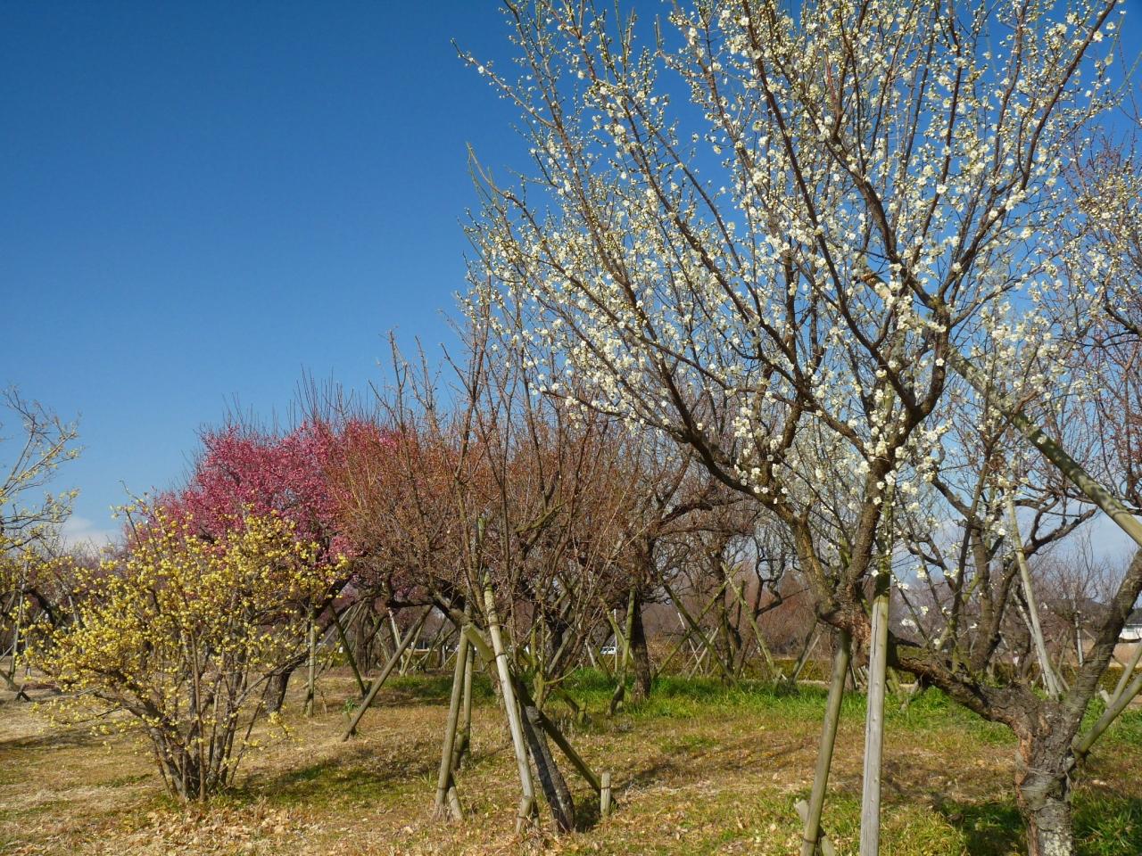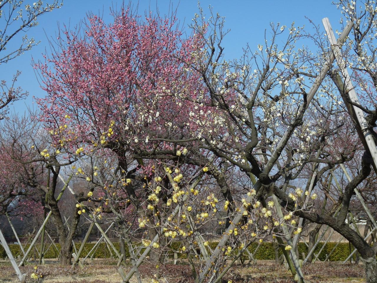 白と、紅と、黄色が、並んで咲いているところを楽しめるのは、この梅林の魅力です。