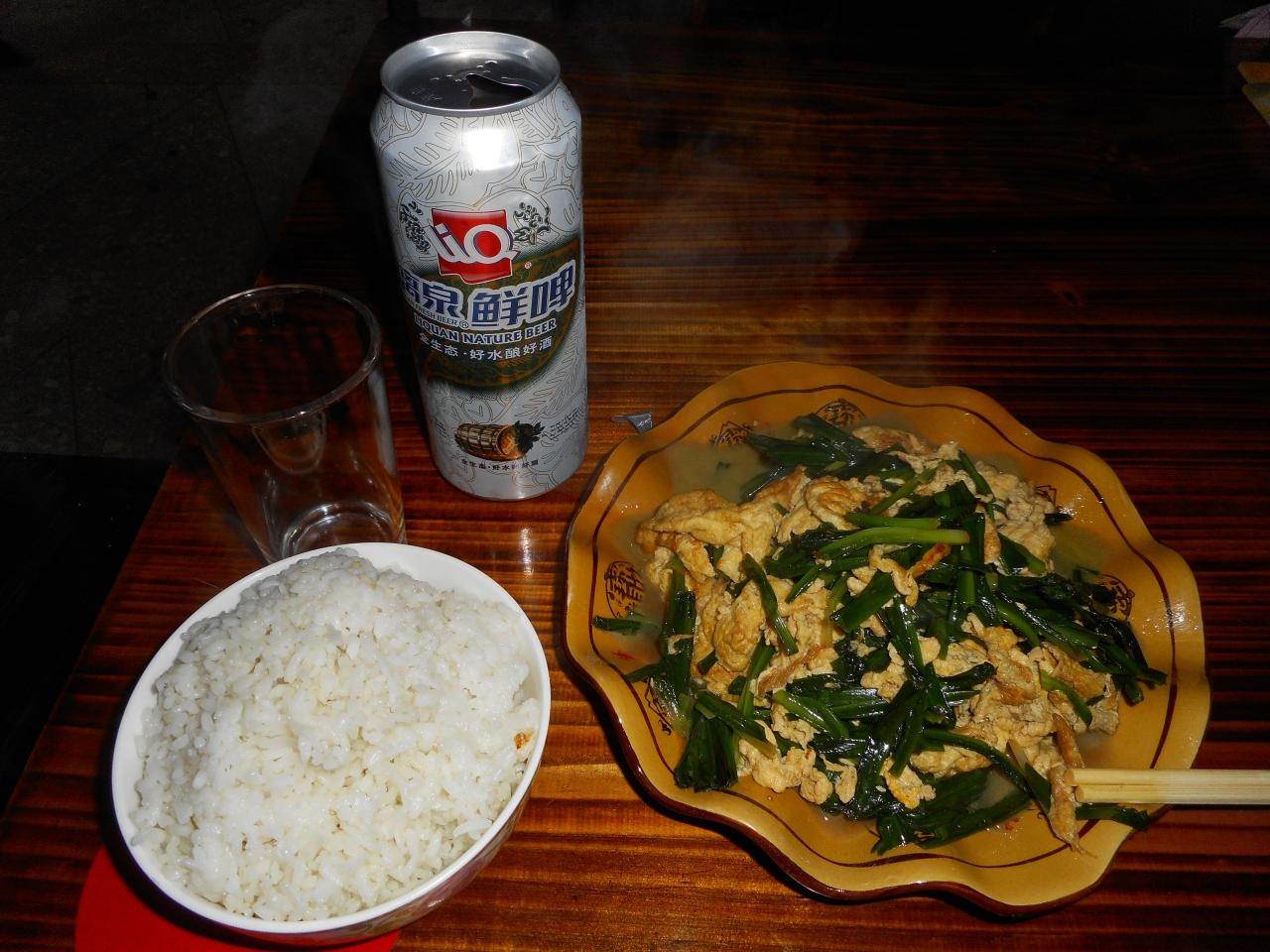 さて、宿で暑いシャワーを浴びた後、夕食を出してもらいました。野菜と卵が食べたいというと、てんこもりの韮玉が。食事が出るまで、女老板の孫娘と、食堂ごっこ(客とウエイトレス)をして遊びました。