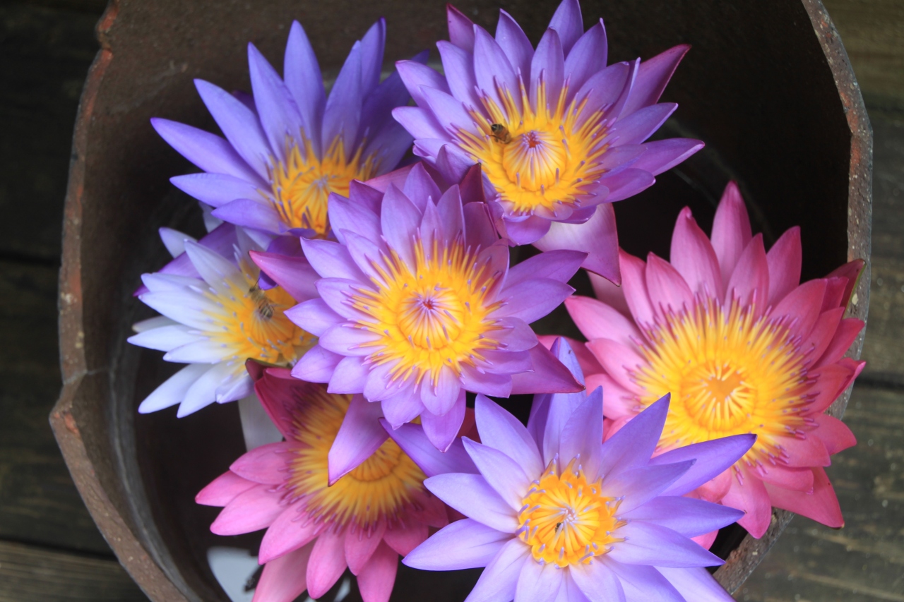 南国風の水連が床のそこここに置かれた店内でマンゴージュースで祝杯をあげました♪