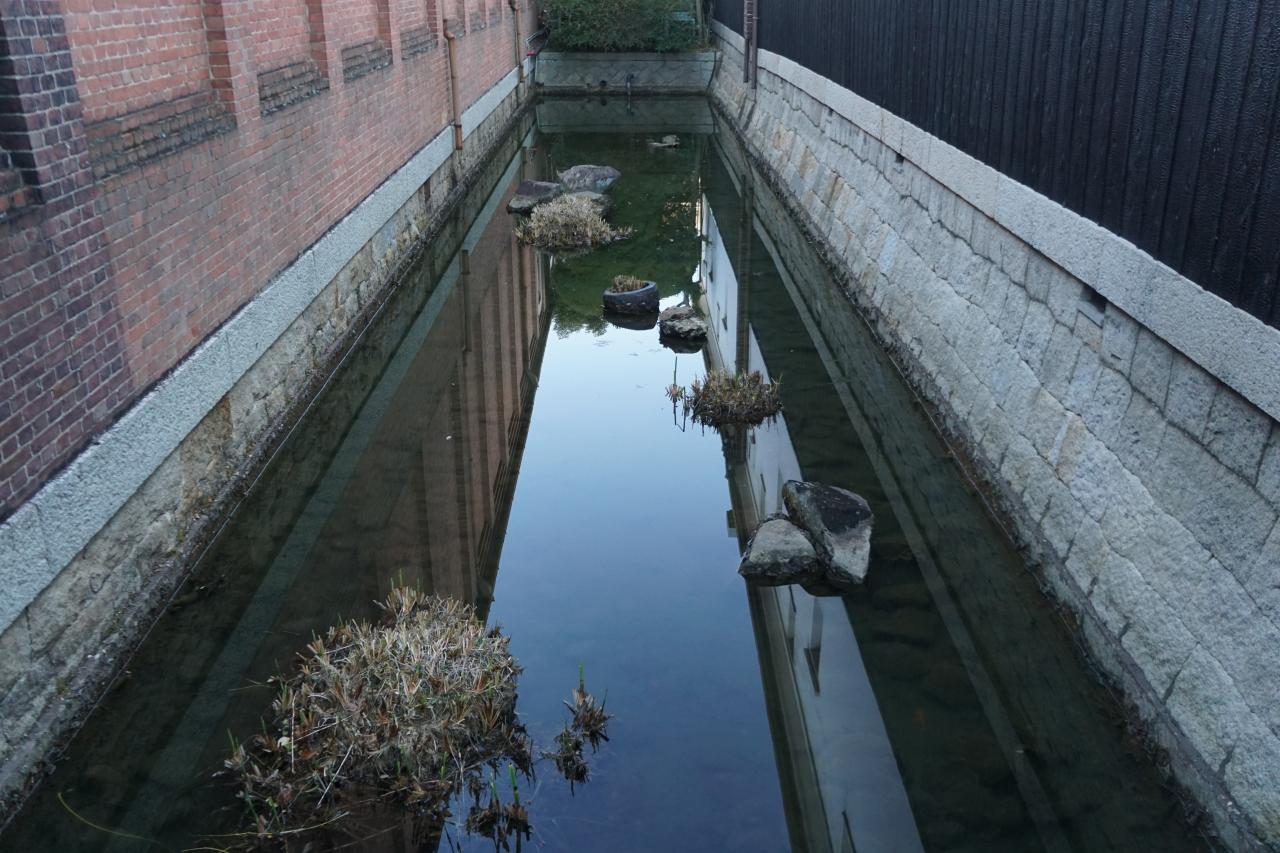 すぐそばには内濠遺構も。内濠遺構は、小さな水路跡のようなちょっとした場所なので、今ではかつての防御を目的とした濠にはとても見えません。水草も植えてあって、むしろ潤いのある景色。夜にはライトアップもされていました。