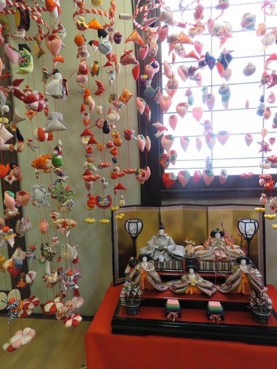 入り口の近くには絢爛豪華な雛段と左右には雛のつるし飾りが見られた。 -