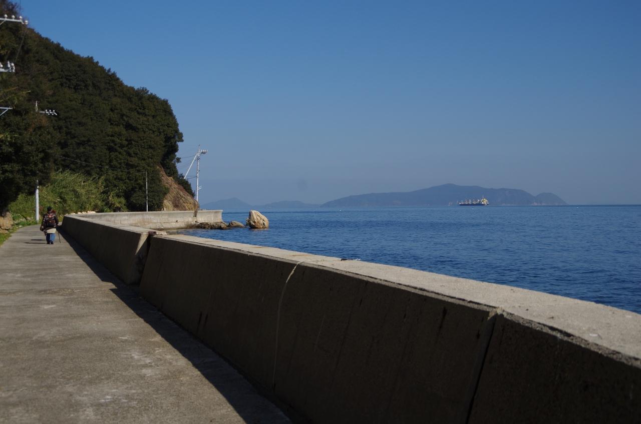 六島小学校に向かう道で下山。前方には佐柳島(左)と高見島(右)が見えます。
