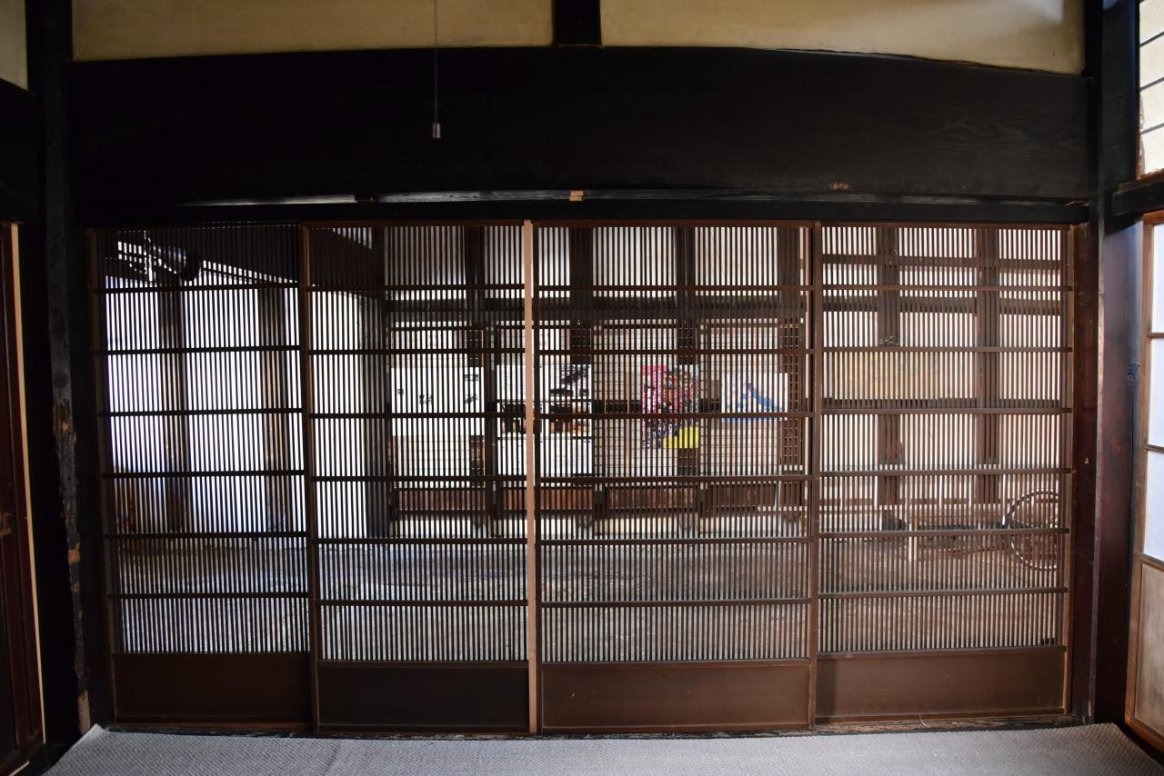 室内側の格子戸を透かして大土間を見たところです。