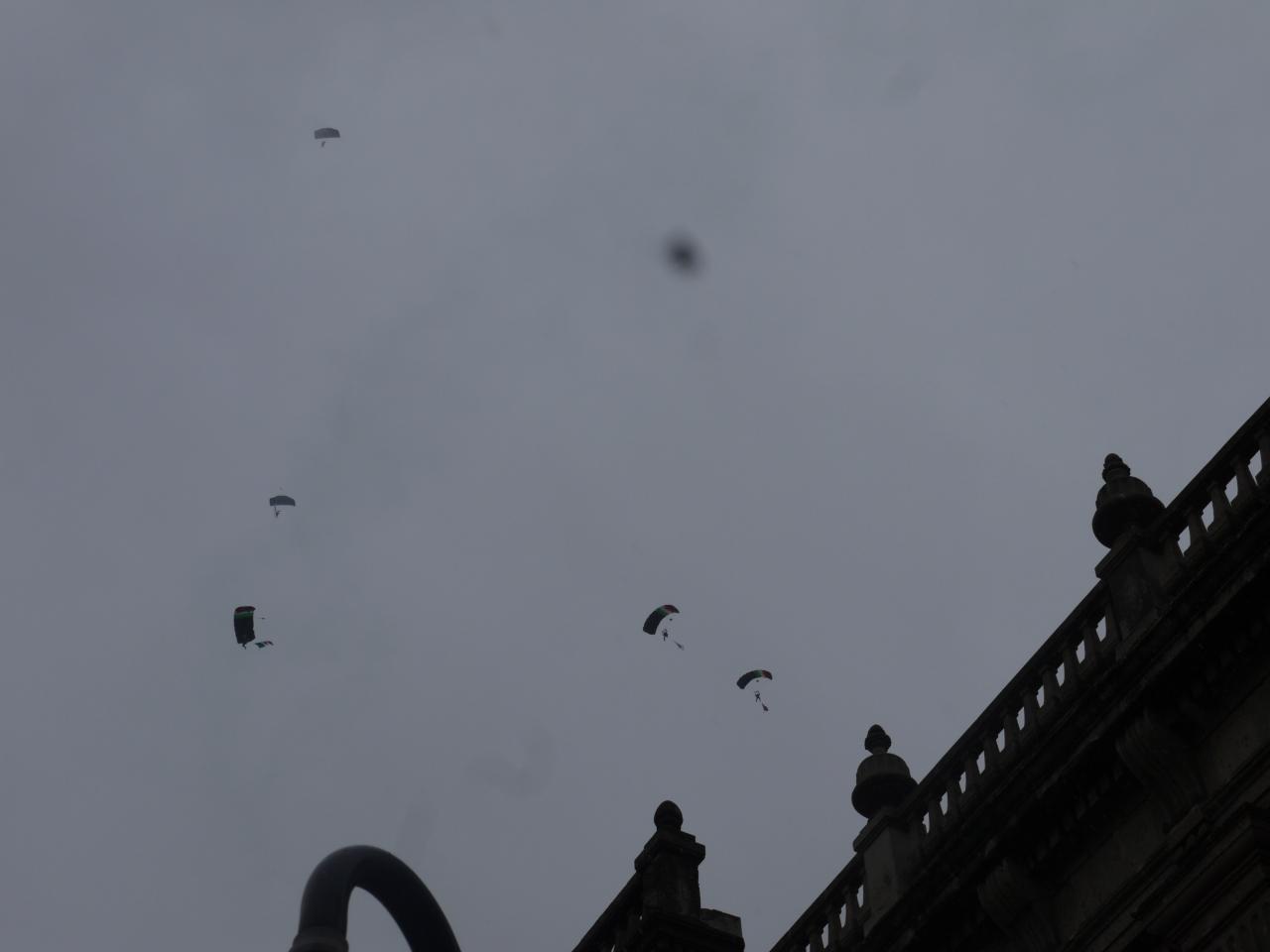 賑わう旧市街の中央広場(ソカロ)を目指していたら、上空からパラシュートのパフォーマーかな。 -