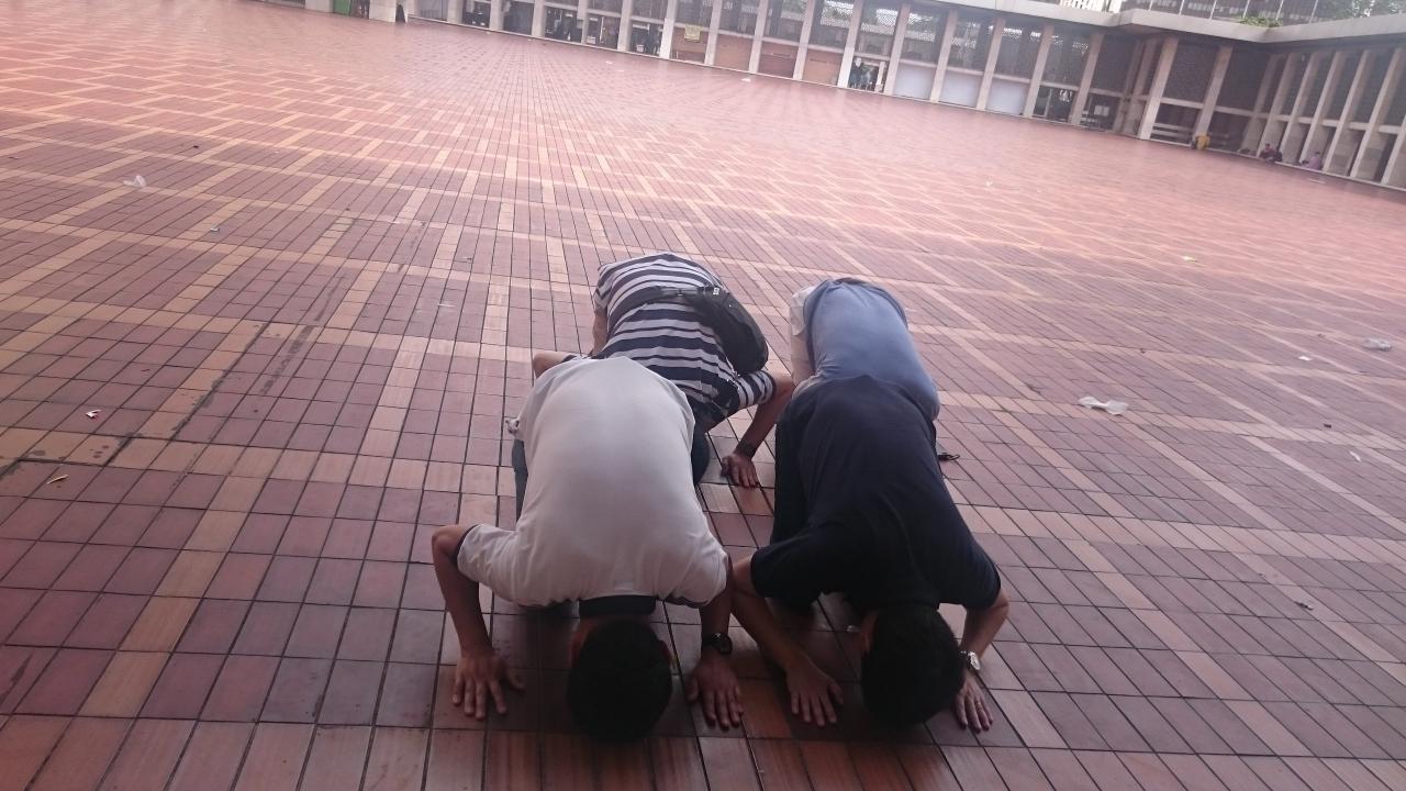 そのガイドさんの教えに倣って、実際に格好を真似てみました。神聖な行為を真似て良いのかという思いはあったのですが、むしろガイドさんも笑顔で撮ってくださり、我々もイスラム教に対する理解が少し深まりました。