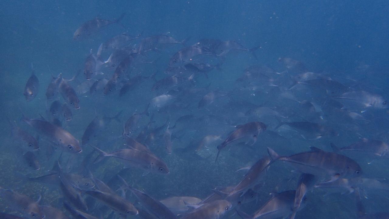 クオリアビーチでシュノーケル。アジ?魚群