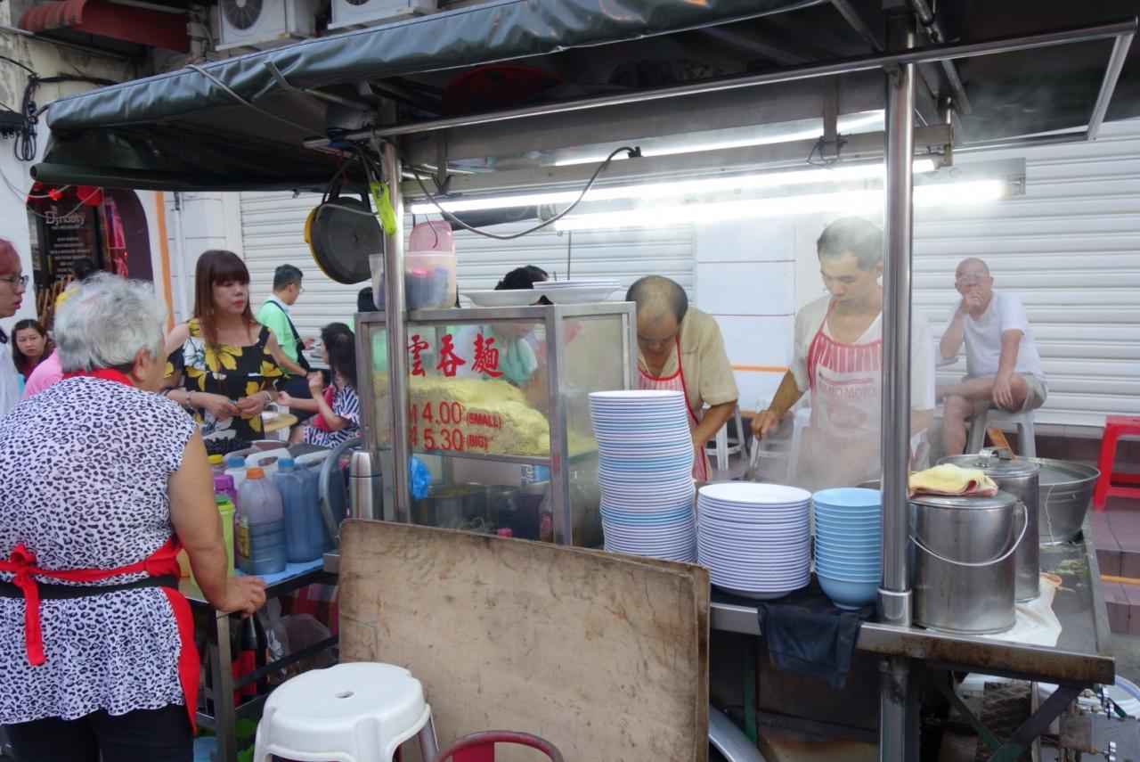賑わってるのは、雲呑麺屋さんのようです。よく見ると、隅っこの2人掛けが空いてますね。