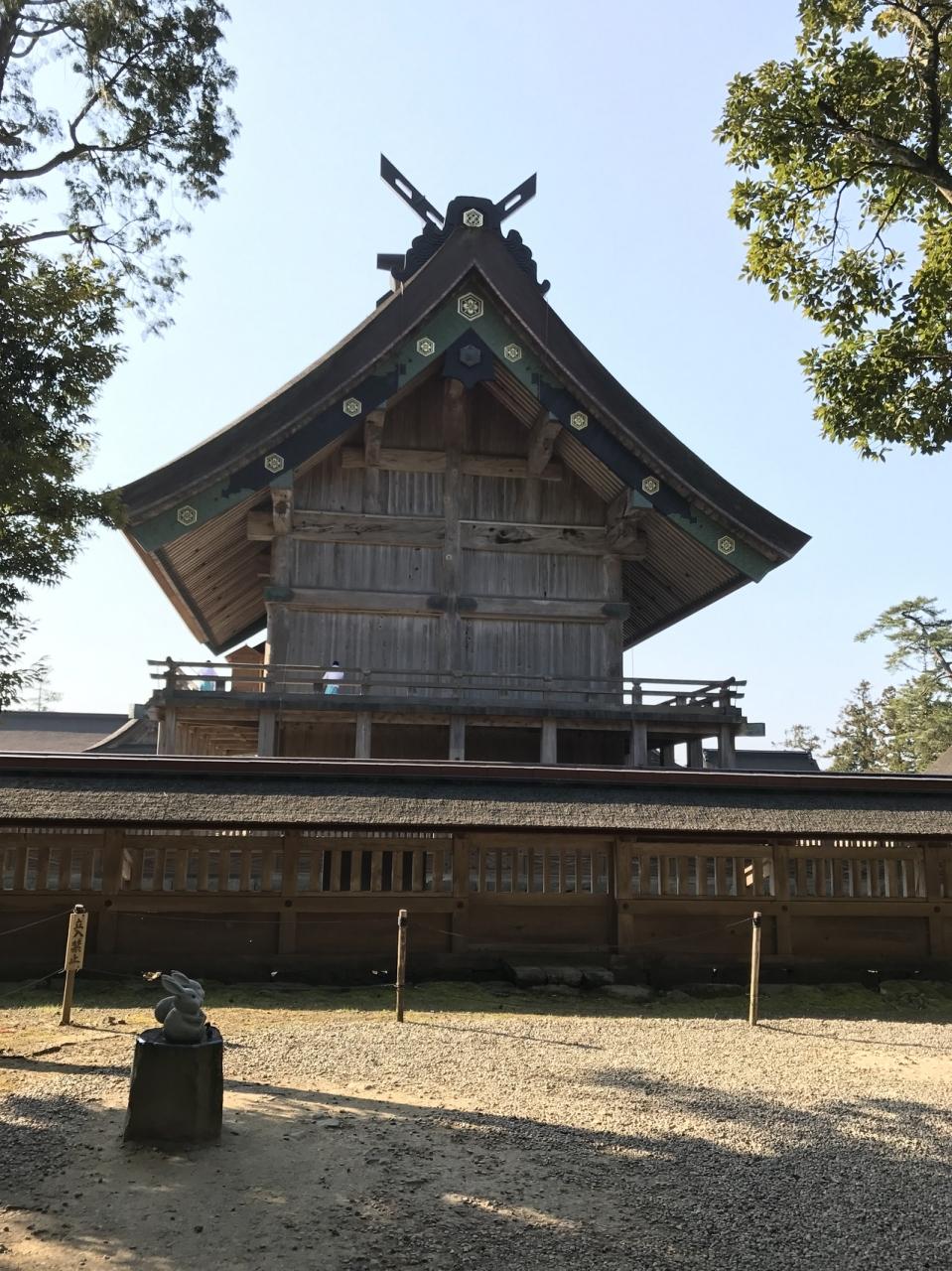 松の参道脇にある小さな鳥居。知らない方も多いらしいですが〝杵那築(きなつき)の森〟と言うそうです。昔からお社はなく、出雲大社の社殿を築く為に用いた道具が埋納されている場所だということでした。そして参道を歩き、ムスビの御神像、四の鳥居、新馬・神牛像と辿った後、拝殿に参拝します。そして本殿へ。タイミングが良かったのか人が写りこまずに写真が撮れました。この本殿前の石畳に書かれた大きな丸ですが、これは平成12・13年に発見された〝御柱〟の場所を示しているそうです。現在は埋め戻され、その場所がわかるようにされています。そのうち〝宇豆柱〟は、島根県立古代出雲歴史博物館にて見ることができます。