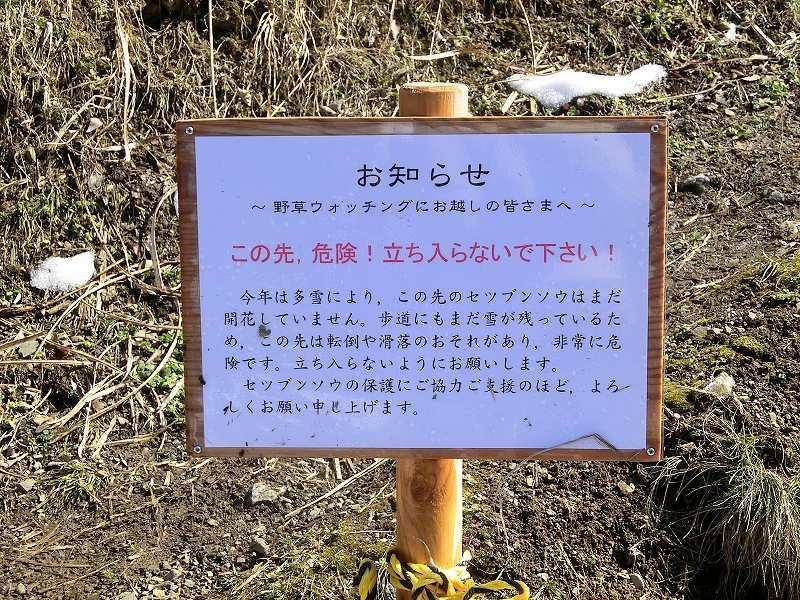 米原市大久保に着いて、いつものセツブンソウの群生地がある場所に向かうと、こんな看板が。例年だと雪が融けてセツブンソウを見ることができるのですが、今年はまだ雪の中のようです。