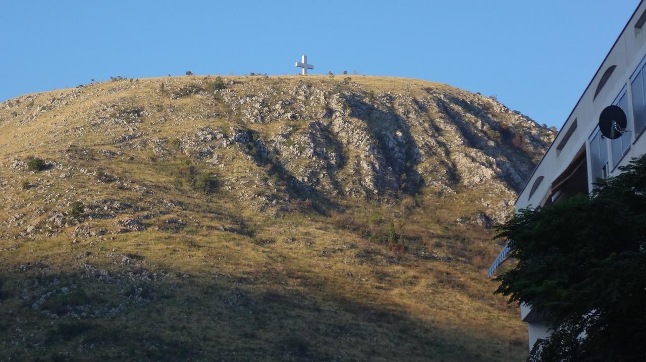 向こうの山の上に大きな十字架が見えます。ネレトヴァ川 滝・河川・湖