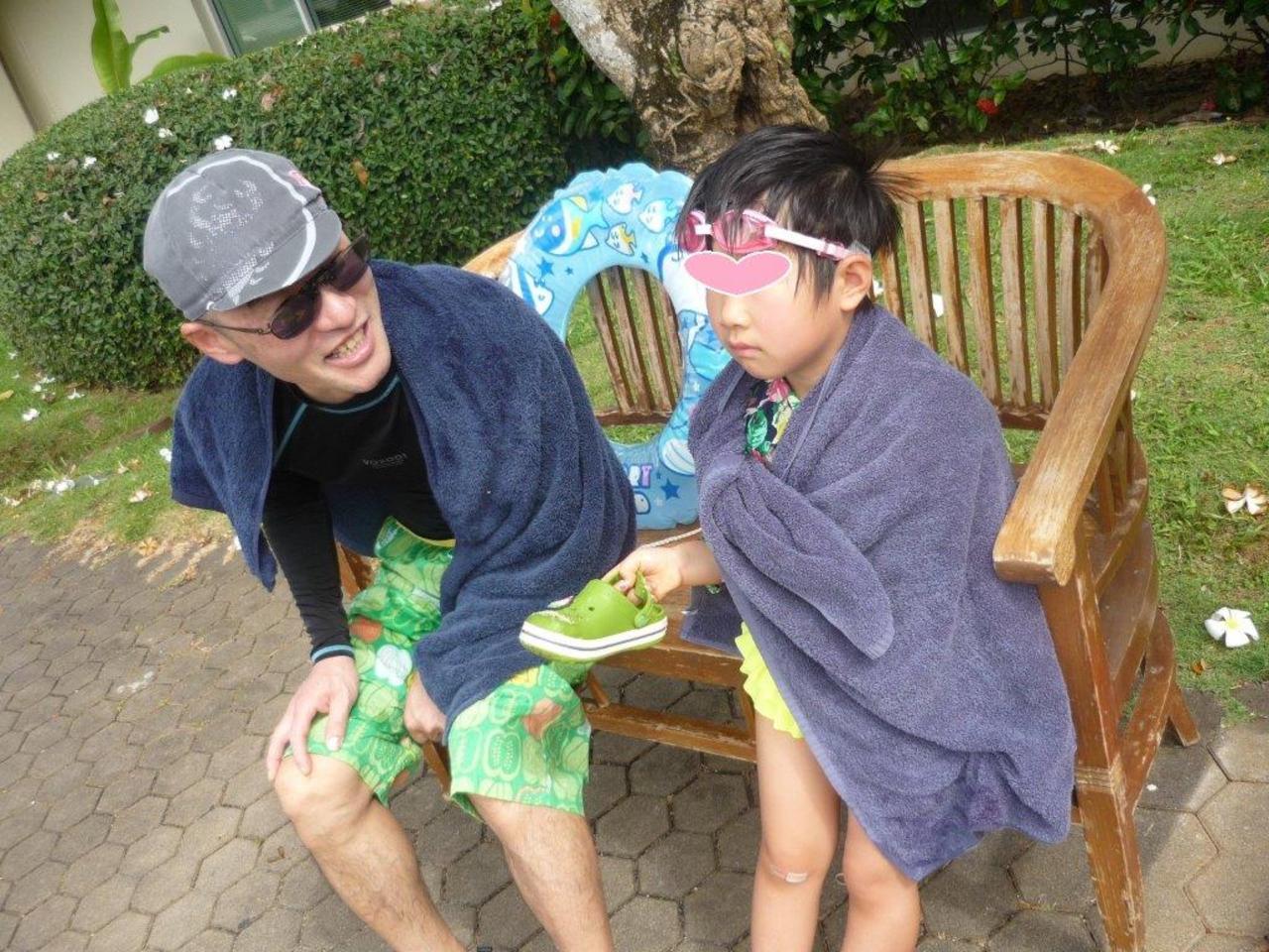 すぐに海からあがってきて、海で泳いでいるパパに向かって、「帰りたい~」と大声で泣き叫ぶ~