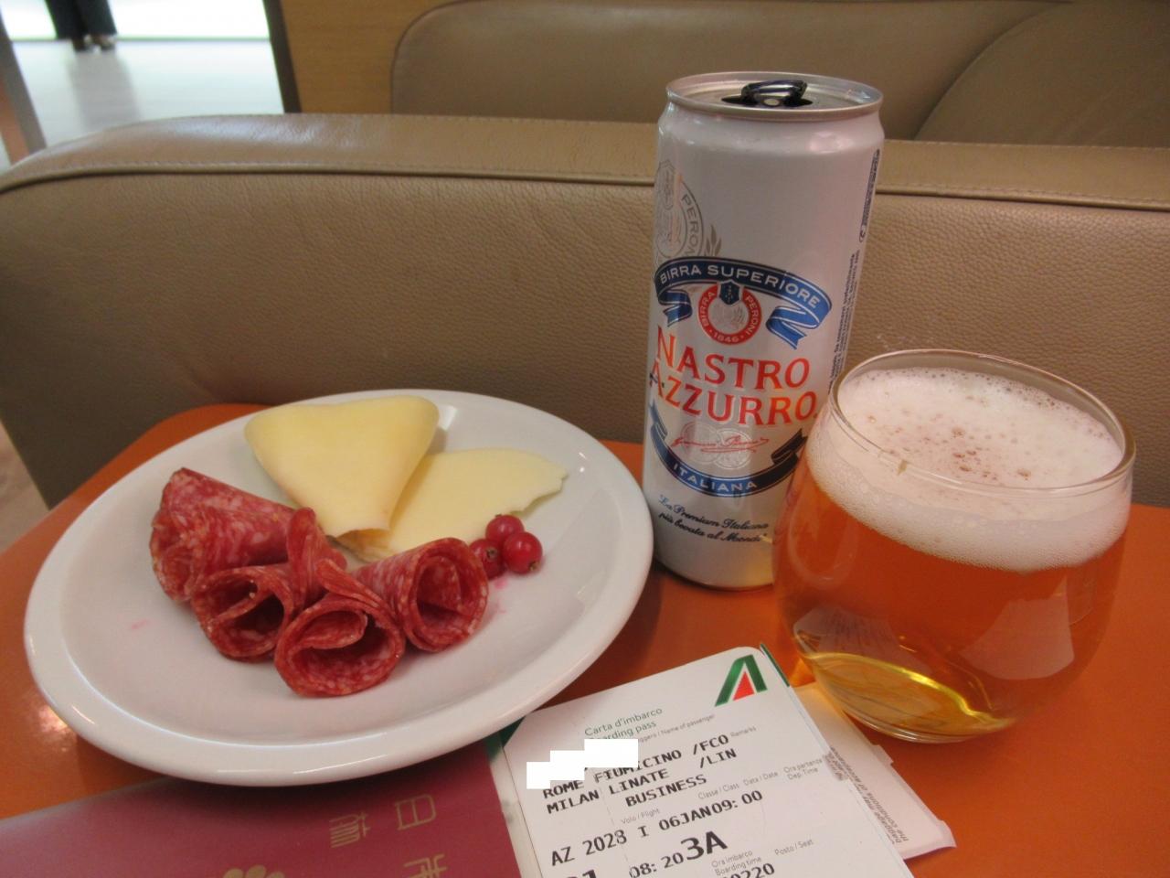 その後は美味しいサラミとチーズに合わせてビールを頂きます。この日はこの後、国際線ラウンジや機内でワインばかりになりそうだったので、早朝と言うこともあり「自粛して」ビールでやめておきました(笑)