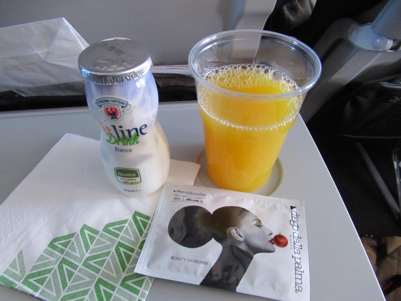 国内線はビジネスクラスでもアルコールは出ないようです。朝の便なのでヨーグルトにオレンジジュースを頂きます。