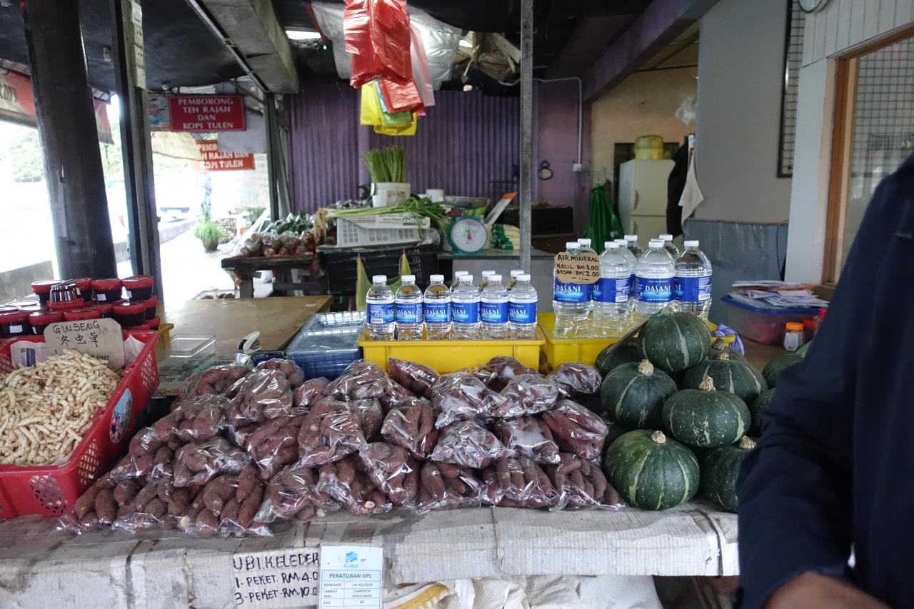 山中の朝市です。花、菓子、人形、Tシャツ、オモチャ等のお土産品やトウモロコシ、サツマイモ、カボチャ、冬虫草などがあり、マレー風の少女やおばさん達が露天の軒を並べています。 -