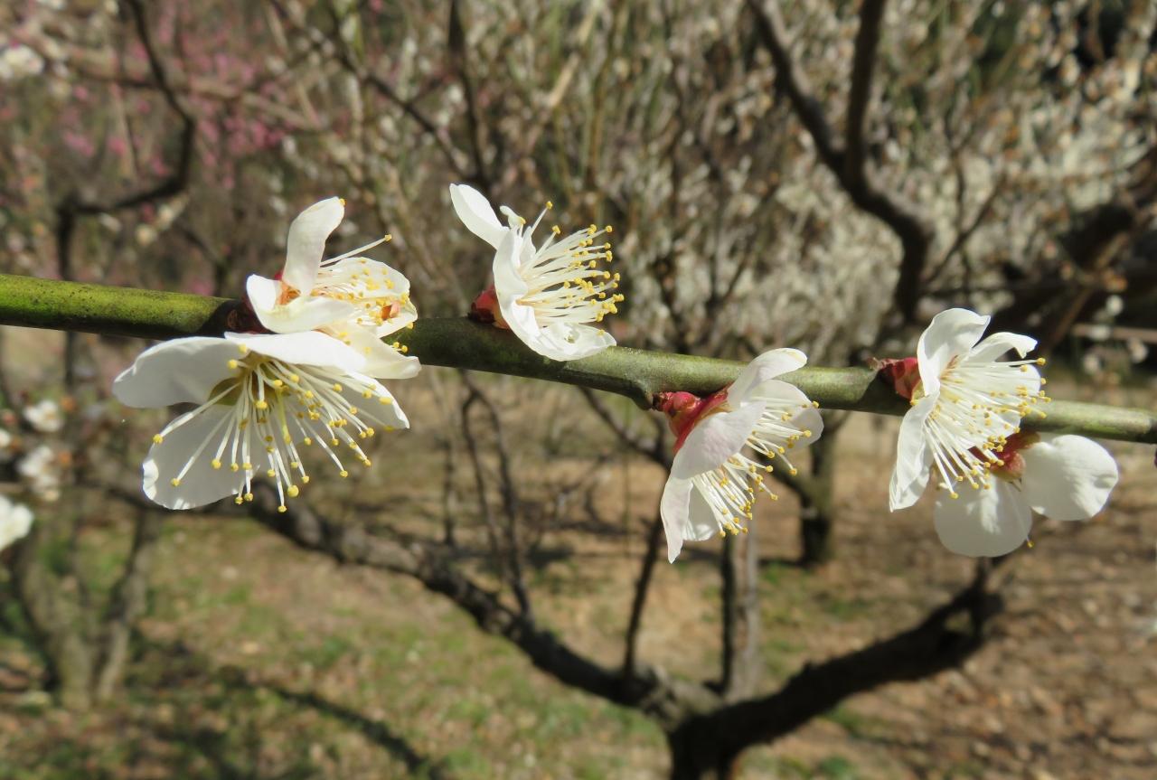 2017春、佐布里池の梅林(3/8):青軸、佐布里梅、白加賀梅、八重咲の紅梅