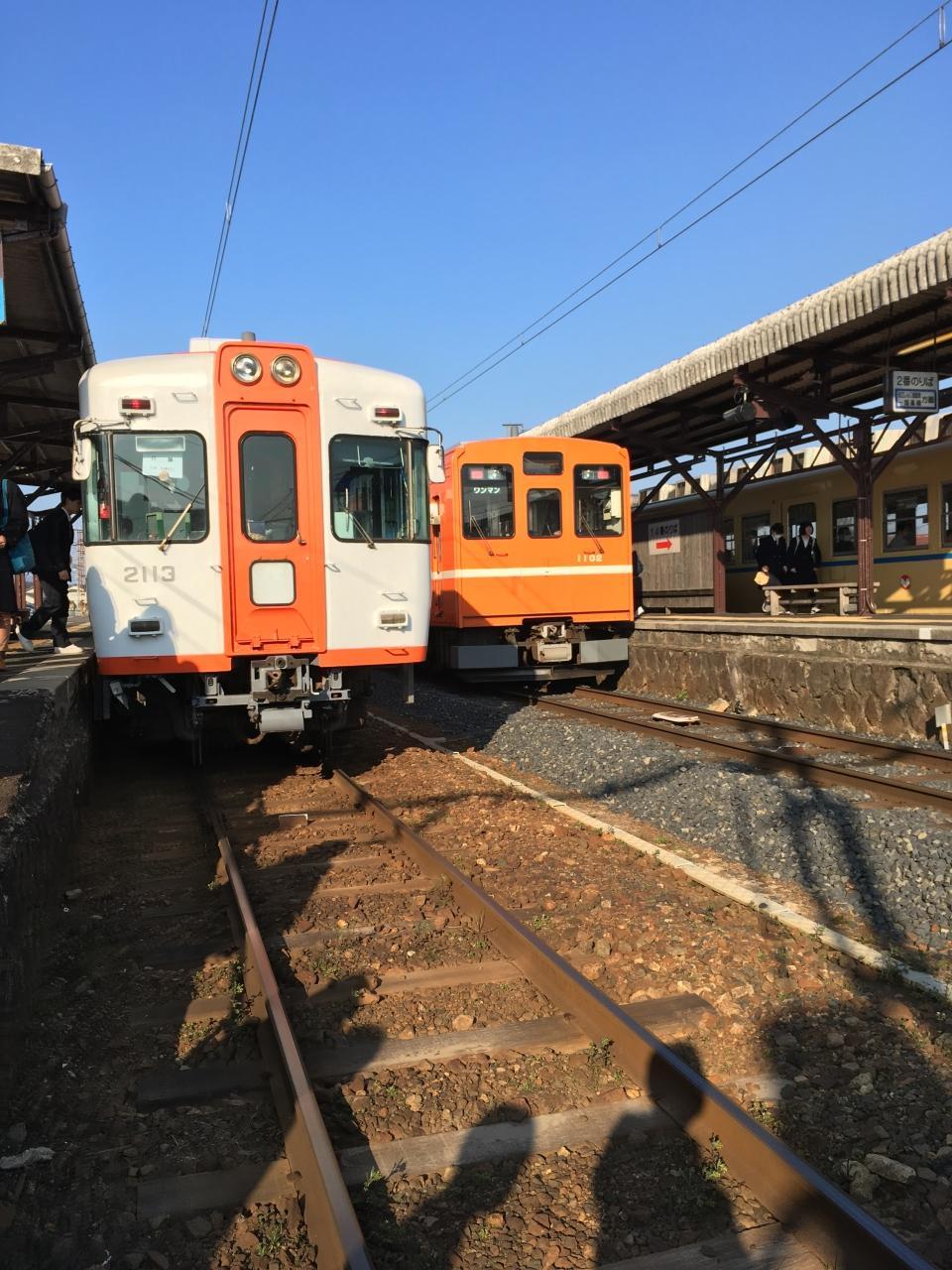 出雲大社前から乗ってきた一畑電車楯縫仕様〝デハ2113〟と、松江しんじ湖温泉まで乗車する1000系〝クハ1102〟♪