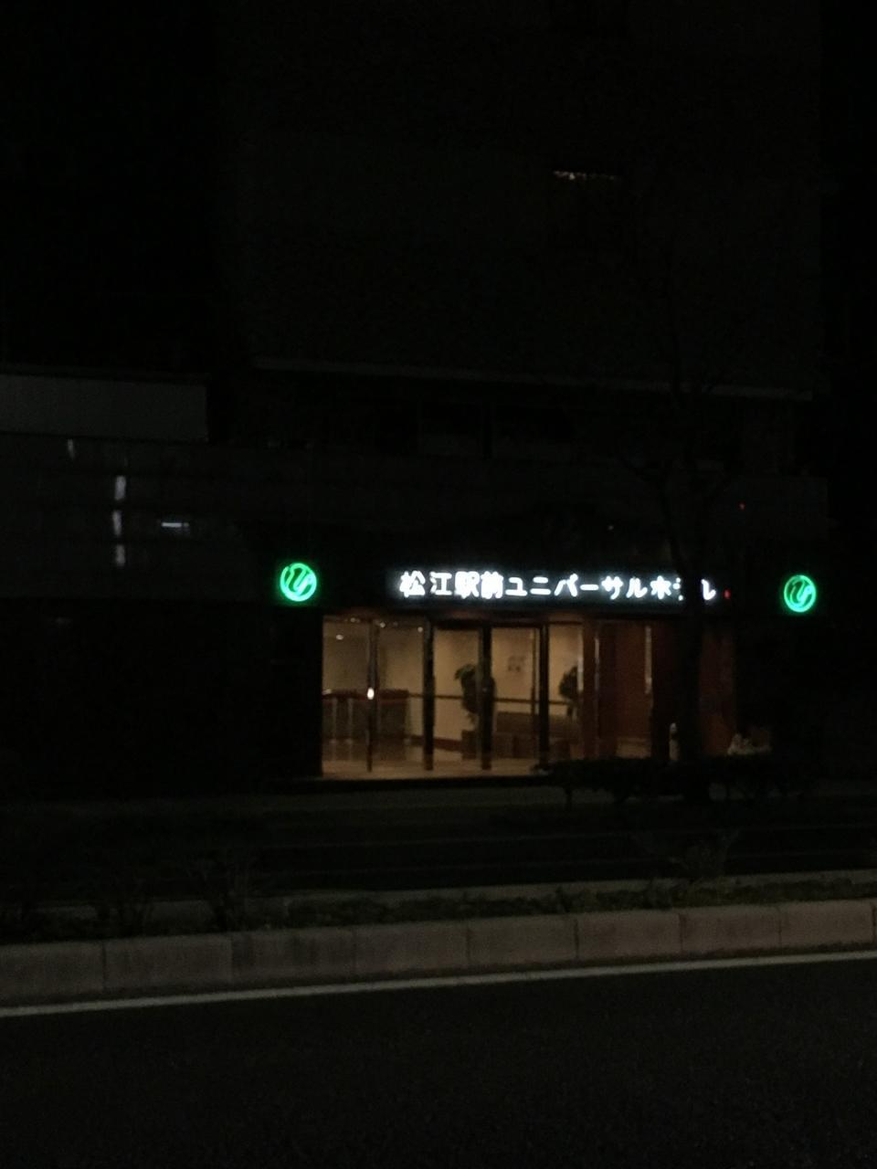 無事お土産を仕入れ、ホテルへと向かいます。dポイントが使えた〝松江駅前ユニバーサルホテル〟は、駅から徒歩30秒と書いてあります。しか~し場所がわかりません。ちなみに松江駅前には3つのユニバーサルホテルがあり、他のふたつ〝松江ユニバーサルホテル〟と〝松江ユニバーサルホテル別館〟は見つけられたものの、肝心な〝松江駅前ユニバーサルホテル〟は見つけられません。ならば~とスマホナビを起動させ、道案内をさせるも、逆方向に進んだり、通過したりと手こずり、20分近くかかってやっと裏口に到着します。さすがに30秒では着きません・・・。
