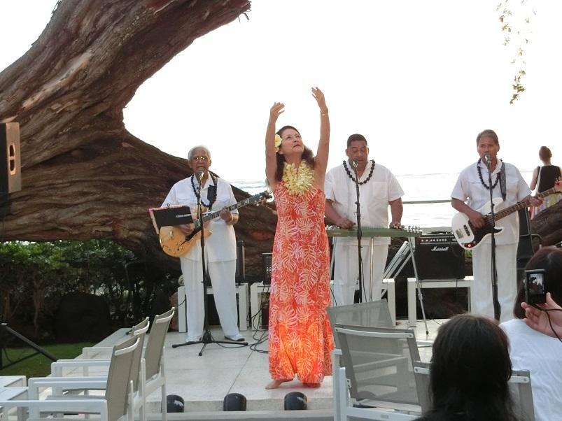 食事をして~ビールを飲みながらハワイアン・ミュージックの生演奏を聴いて~海に沈む夕日を見て~夕日が沈んだ後の夕焼けを見て~「ハレクラニの華」と呼ばれているカノエ・ミラーさんのフラダンスを見て、非常に贅沢なひと時を過ごすことができました。