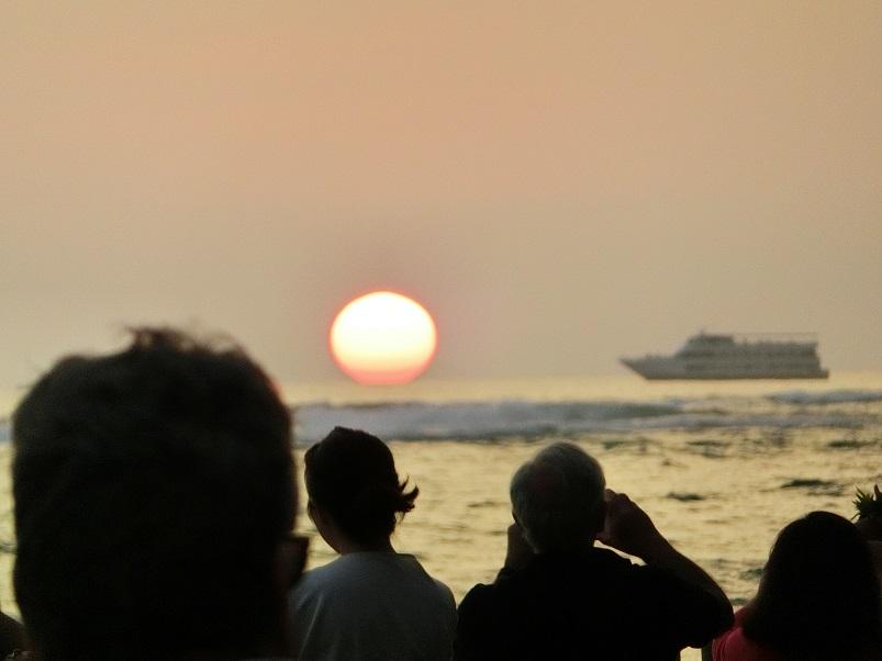 観客はハワイアン・ミュージックを聞きながら、海に沈みつつある夕日を見ながら、カノエ・ミラーさんのステージが始まるのを待ちます。