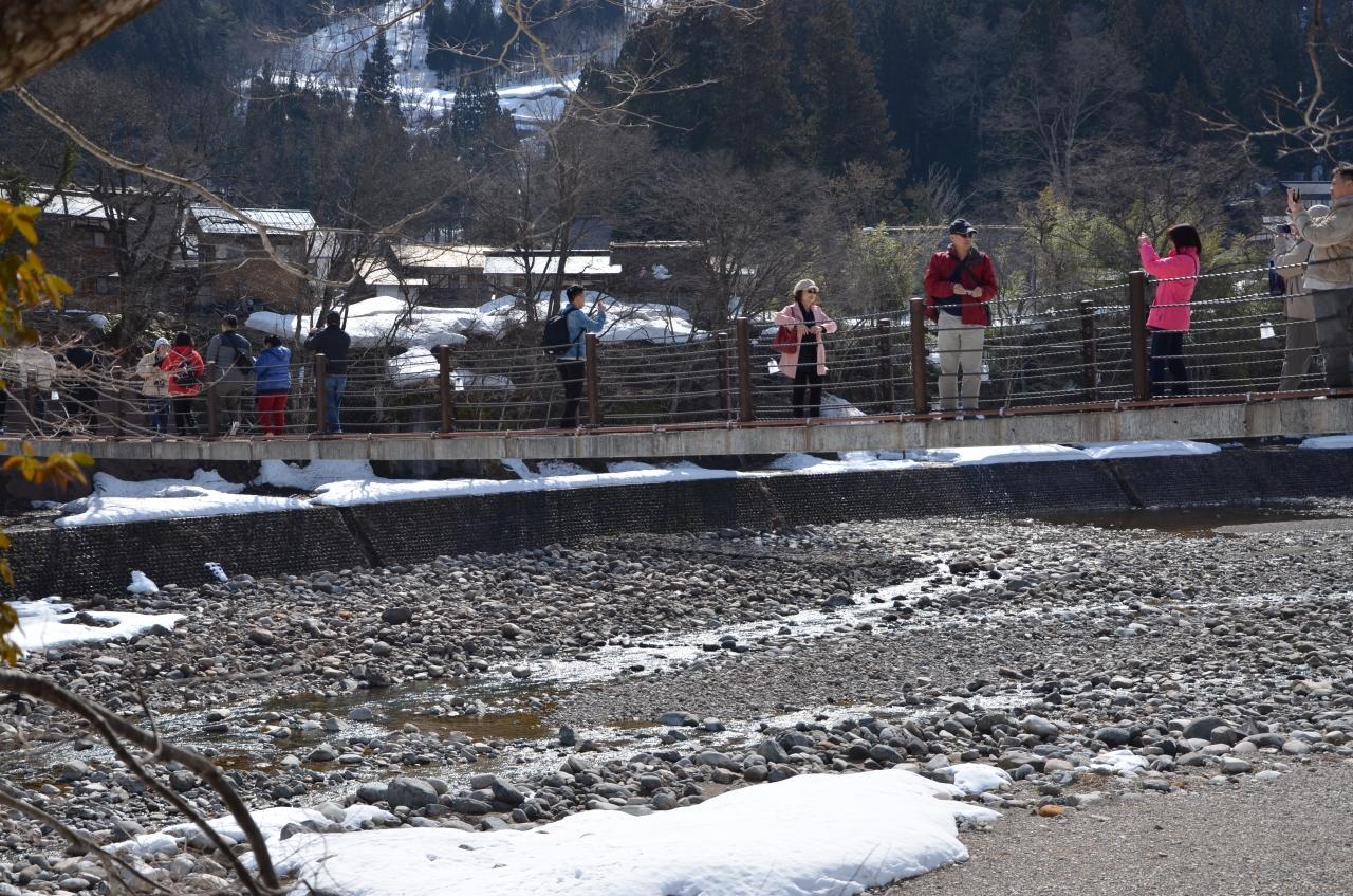 *集落側から見た「であい橋」で対岸はまだまだ残雪が多く残っていました。 -
