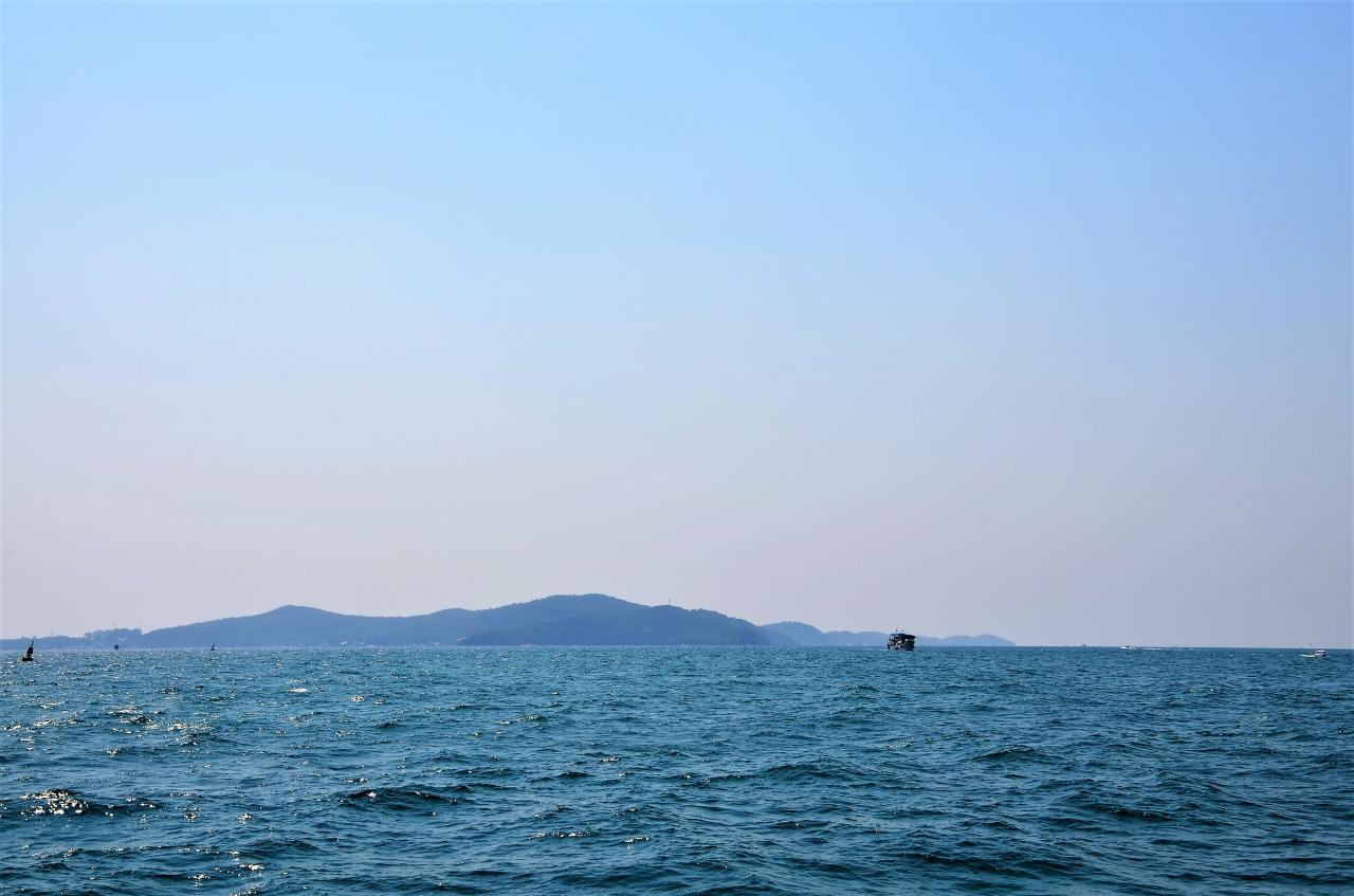 船がしばらく進むと遥か水平線に島影が見えてきました。