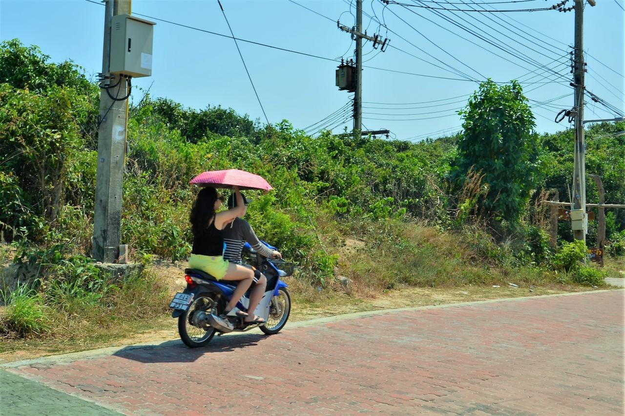 日本じゃあ二ケツ日傘は見れませんね、田舎じゃ雨降りに前後ろに子供を乗せたお母さんが運転しながら片手で傘持っているもんね(^o^)