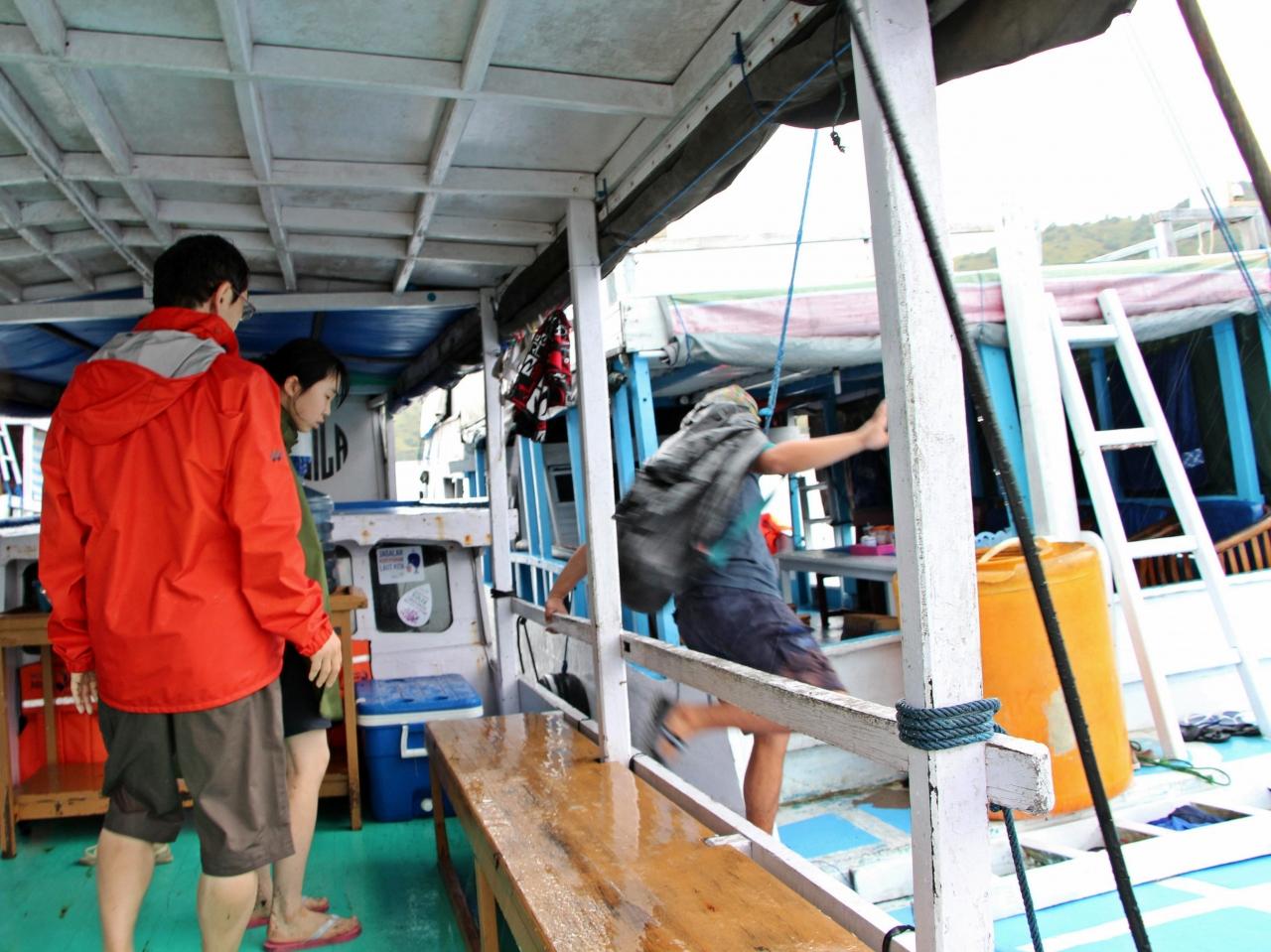 持ち込んだ荷物などは、波しぶきのかからない船の二階(操舵室の前の白い梯子を登った所)へ上げておく。