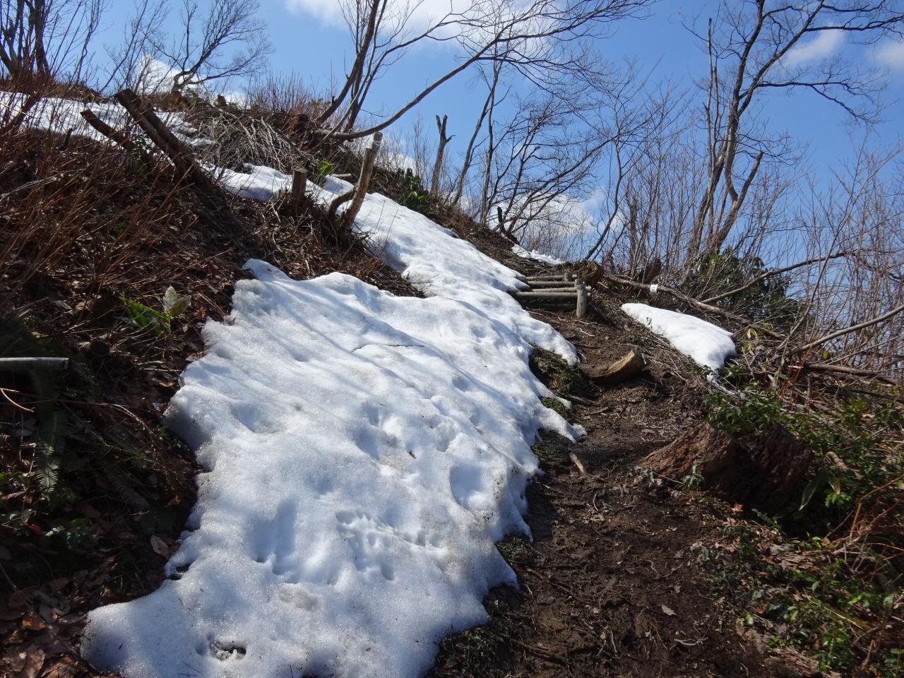 ハゲ山から城ヶ平山への縦走路には、特に問題のない程度ですが所々に残雪がありました。