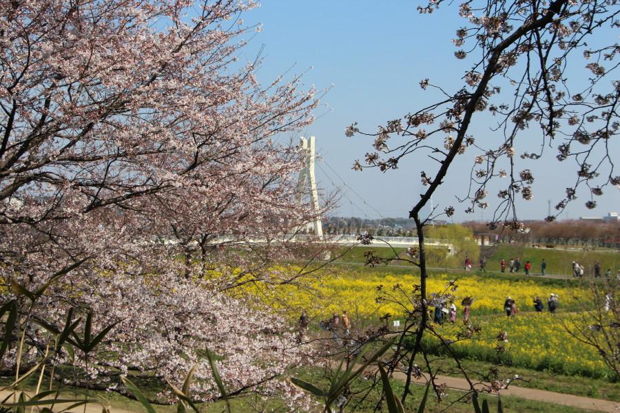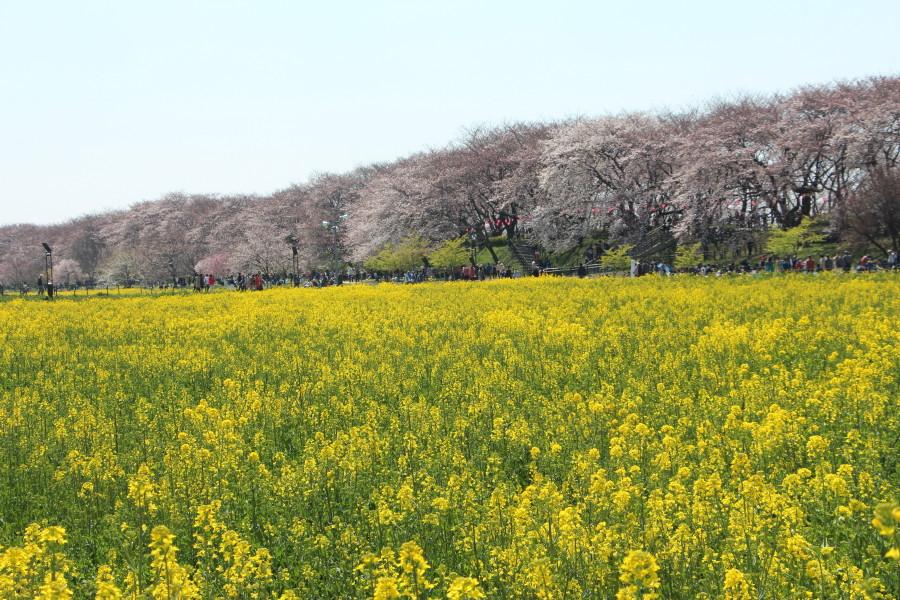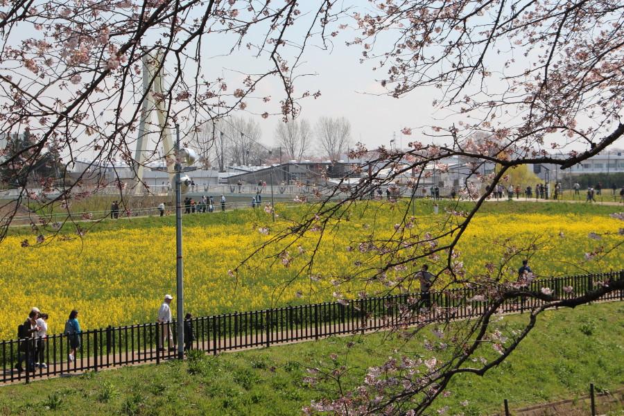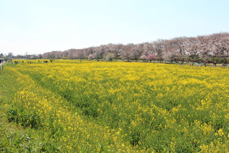 菜の花畑から桜並木を眺めます。