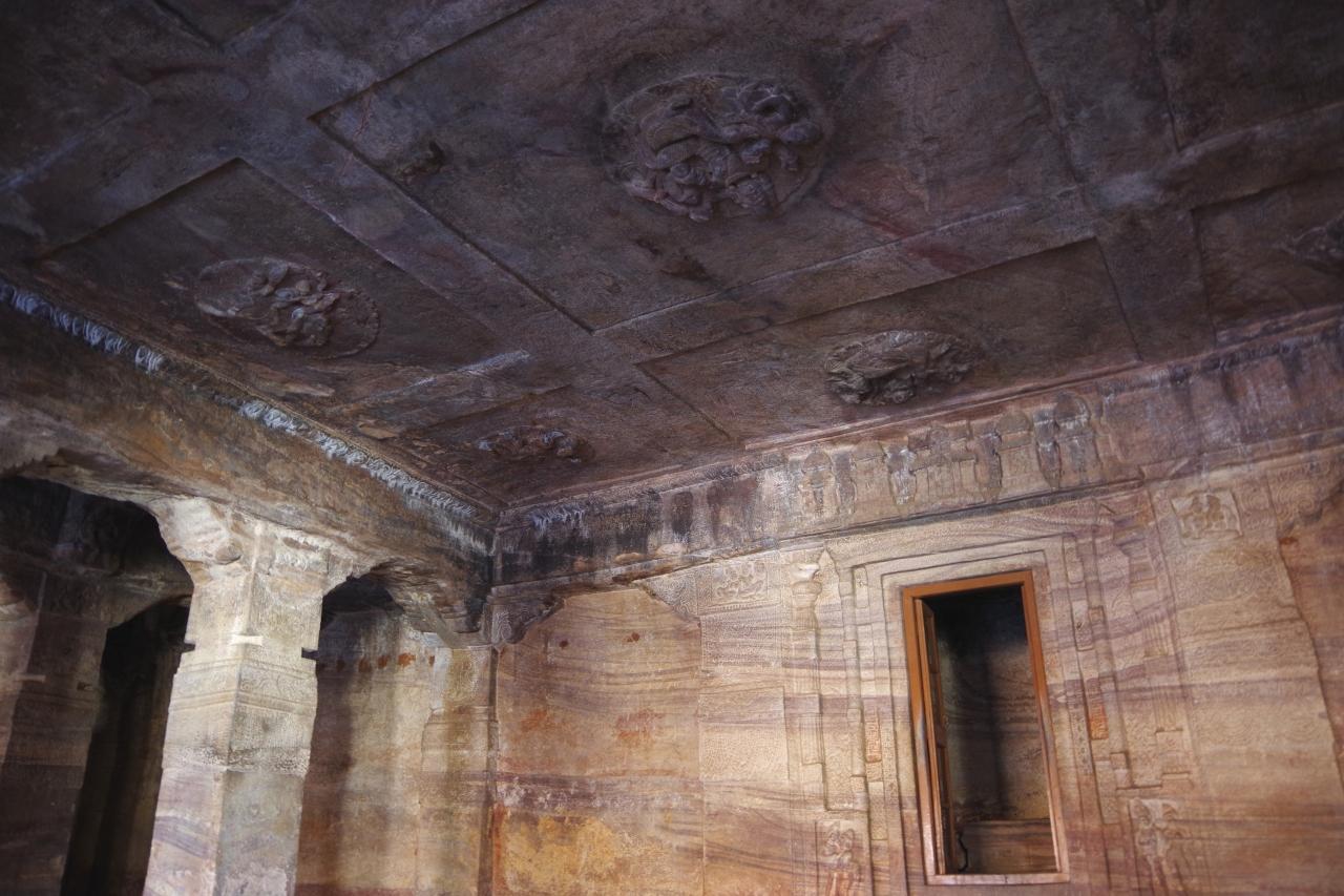 また長い階段を上って、バーダミ最大の石窟寺院である第3窟に入りました。ヴィシュヌ神に奉られた寺院なので、ヴィシュヌ神の化身を表す浮彫が多数見られます。天井付近などに彩色も見られ、意外に明るい色彩に驚きます。