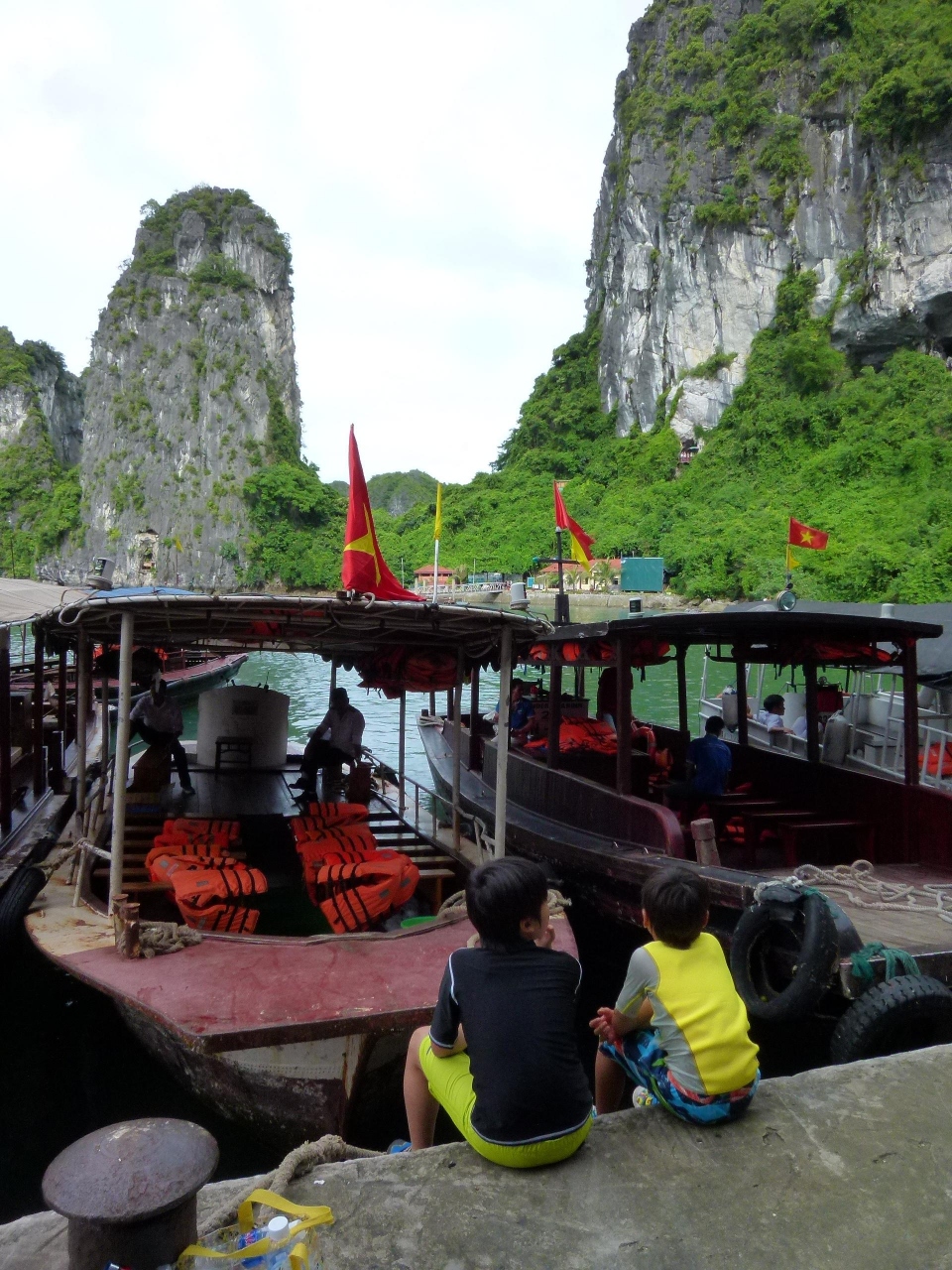 世界遺産の中で、爪を切る親子。ハロン湾クルーズ アクティビティ・乗り物体験