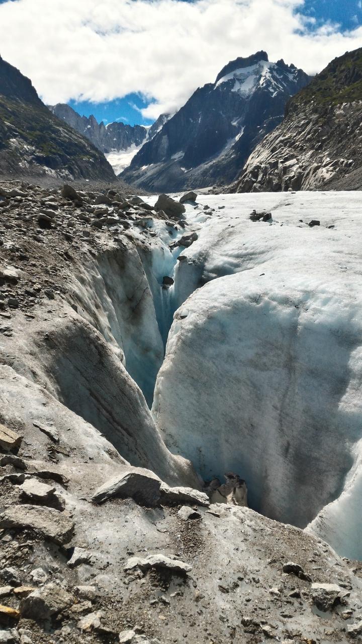 氷河に降りてからのグレポンとグランドジョラス。昔はセラック帯がしばらく続いたのでアイゼンが必着だったのでかなり不安でしたがまるで必要ではありませんでした。