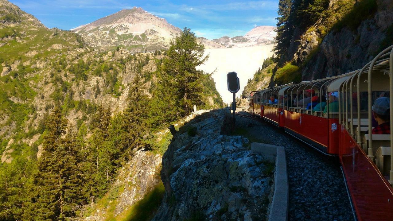 おもちゃの様なトロッコ列車でダム方面に、バックはモンブラン方面。