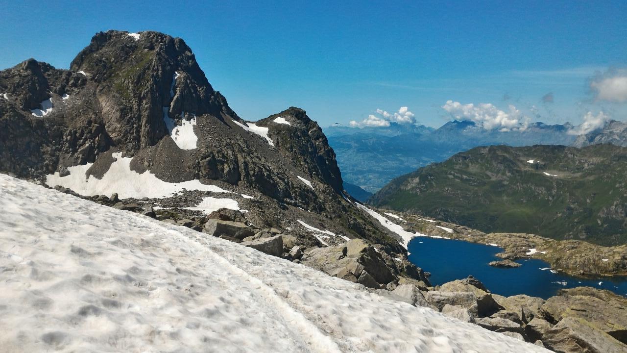 手前の右下りの稜線を歩いているのはツールドモンブランのコース。フォルクラの谷に下って行きます。見えるかな?下に降りてある稜線の左上の方です。