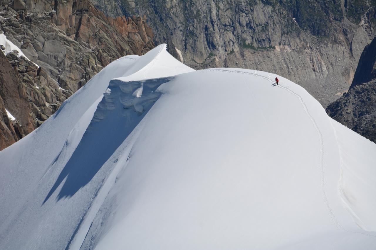 分かりにくいですが、稜線中央ぐらいにケルンがあってシャモニー側に下ります。
