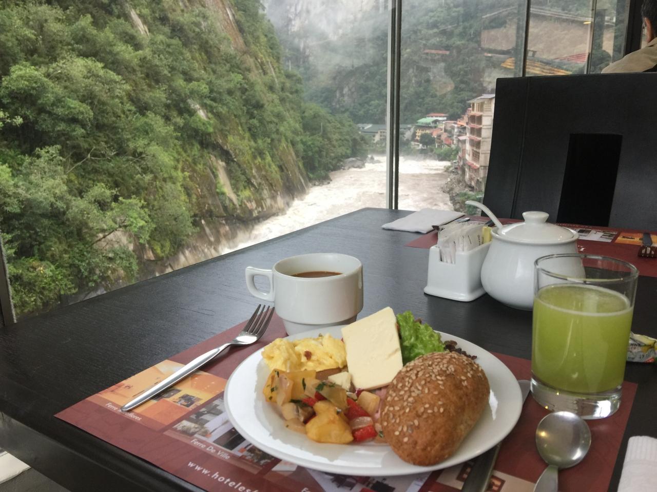ダイニングは景色がいいのだが、前日同様、濁流がゴーゴー流れている。 -