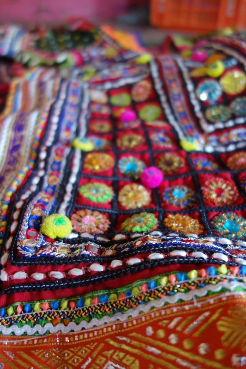 前面にミラーワークや刺繍が施された布製品。
