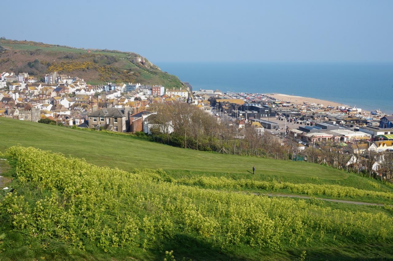 眼下はヘイスティングの旧市街地、左手奥はイースト・ヒル、右手奥はイギリス海峡。