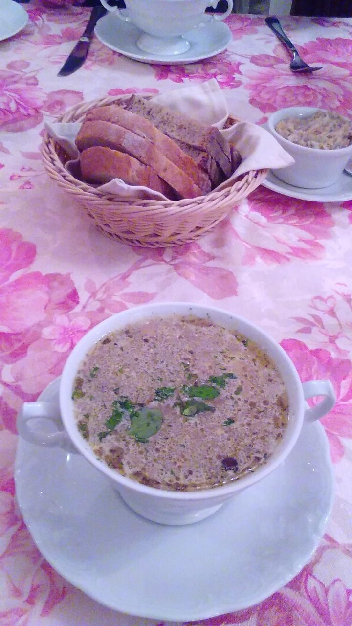まずはポーランド料理の代表、Żurek(ジュレック)からです。ぶつ切りのソーセージとゆで卵、じゃがいもが入っていました。発酵食品らしい程よい酸味と塩味がよく合っていました。