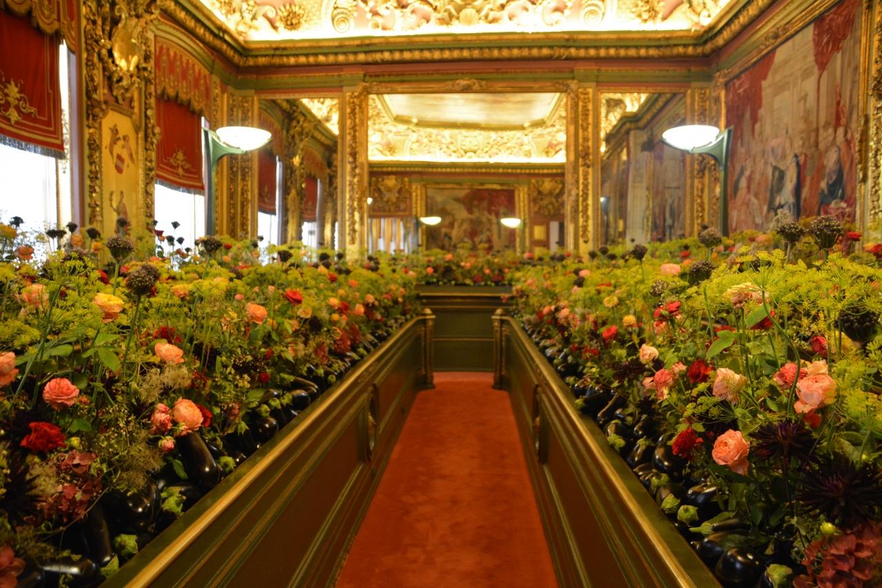 日程的にはオランダ旅行中ですがロッテルダムからブリュッセルに日帰りでフラワーカーペット祭を見に行きました。グランプラス広場に花びらで描かれたものを想像していたのですが、ありませんでした。しかし、市庁舎内に豪華に!艶やかに!装飾された花を見て感激しました。