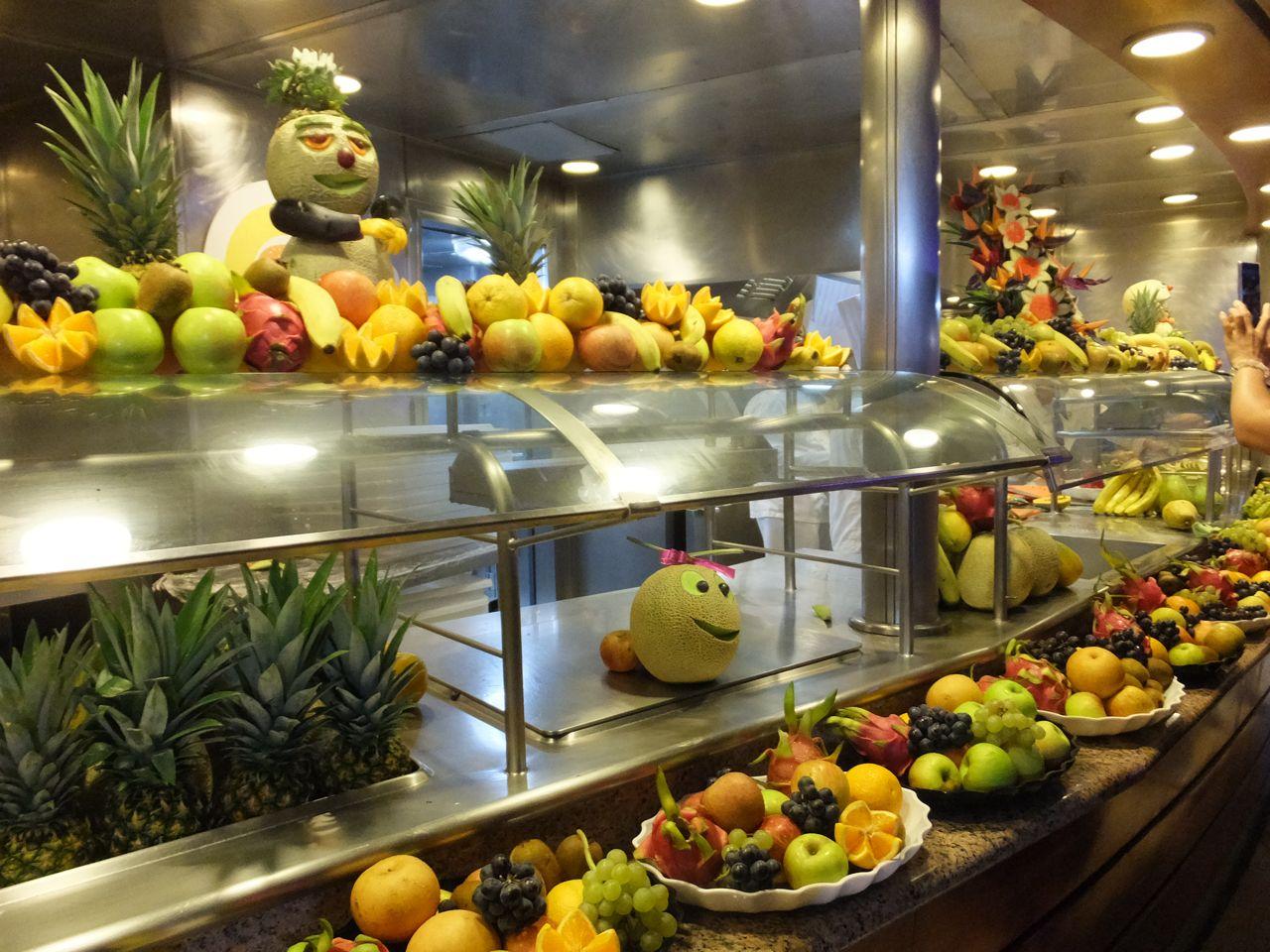 ちょっとフルーツが欲しいなあ、ということでブッフェレストランでフルーツとケーキを。船尾のデッキに持ち出して食べます。