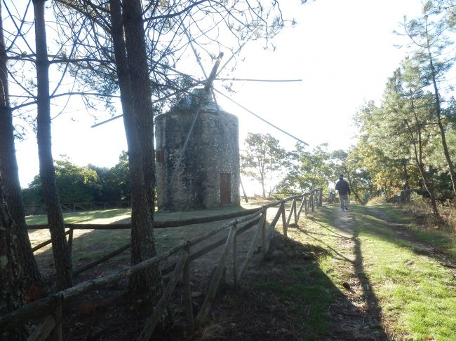 時差ぼけで、2匹とも朝早く目が覚める。昨日は暗かったので周りの様子は解らなかったが、小さな窓から朝日が昇ってくるのが見える。中庭はテラスになっていて、キウイやレモン、ネーブル等がなっている。インコや鶏も飼われていて面白い。畑もあって何か解らない野菜がなっている。朝食はタヌキ特製の野菜一杯入れたマシュルームソース味のシチューだ。昨日スーパーで買い物して、今の日本と比べてここは野菜が凄く安いので、調子にのって一杯買った。ここの宿の主人家族は2階に住んでいるらしいのだが居る気配が無い。今日は日曜だから教会にでも行っているのかも。この辺りを散歩することにした。そもそもここの場所を選んだ理由は、ポルトガルのリスボン、シントラへ行く為の中継地点以外なにもない。ポルトガルでどこにでもある普通の田舎町だ。どこに何があるか解らないので、とりあえずタブレットの地図を頼りに2匹で歩いてみる。景色が良さそうな山の上を目指して歩いていくと、街のあちらこちらで犬に吼えられ威嚇される。日本と違い鎖につないでいないので、道路まで出てきて吠え掛かる。噛みつきははしないだろうが、道を歩くのも容易ではない。この犬達は、人の姿がほとんど無いこの町で、ちゃんと番犬の仕事をしている。地図上に世界遺産のマークが付いた場所があったので、そこを目標に歩いて行く。いたるところに栗の木があって、実をたくさんつけている。栗の木は私有地らしいところと、道路脇や林の中にもあり、キツネは散歩そっちのけで栗拾いにせいを出し始めた。まったく拾ってどうするんだよ。そもそもこの栗食べられるのか?、目的地の世界遺産(じゃないぞ!)のマークの場所は大きな古びた風車だった。ここでもキツネは栗をとっている。今日の晩御飯は栗ご飯にしようとのたまうが、タヌキは栗ご飯嫌い、栗のお菓子は好きだが。しこたま栗をとって帰る。