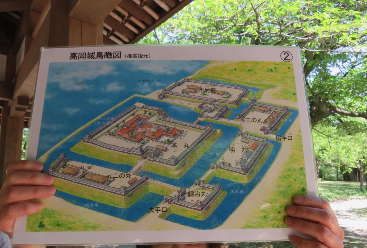 現地ガイドさんが説明用に用意されていた資料の一つです。先に紹介した高岡城の縄張りが、立体図で記されていました。水堀を多重に廻らした防御線が一目瞭然でした。先程の看板の図面を、反時計回りに90度ほど回転させた図面になります。高岡城は、日本百名城の33番に選ばれています。(同上)