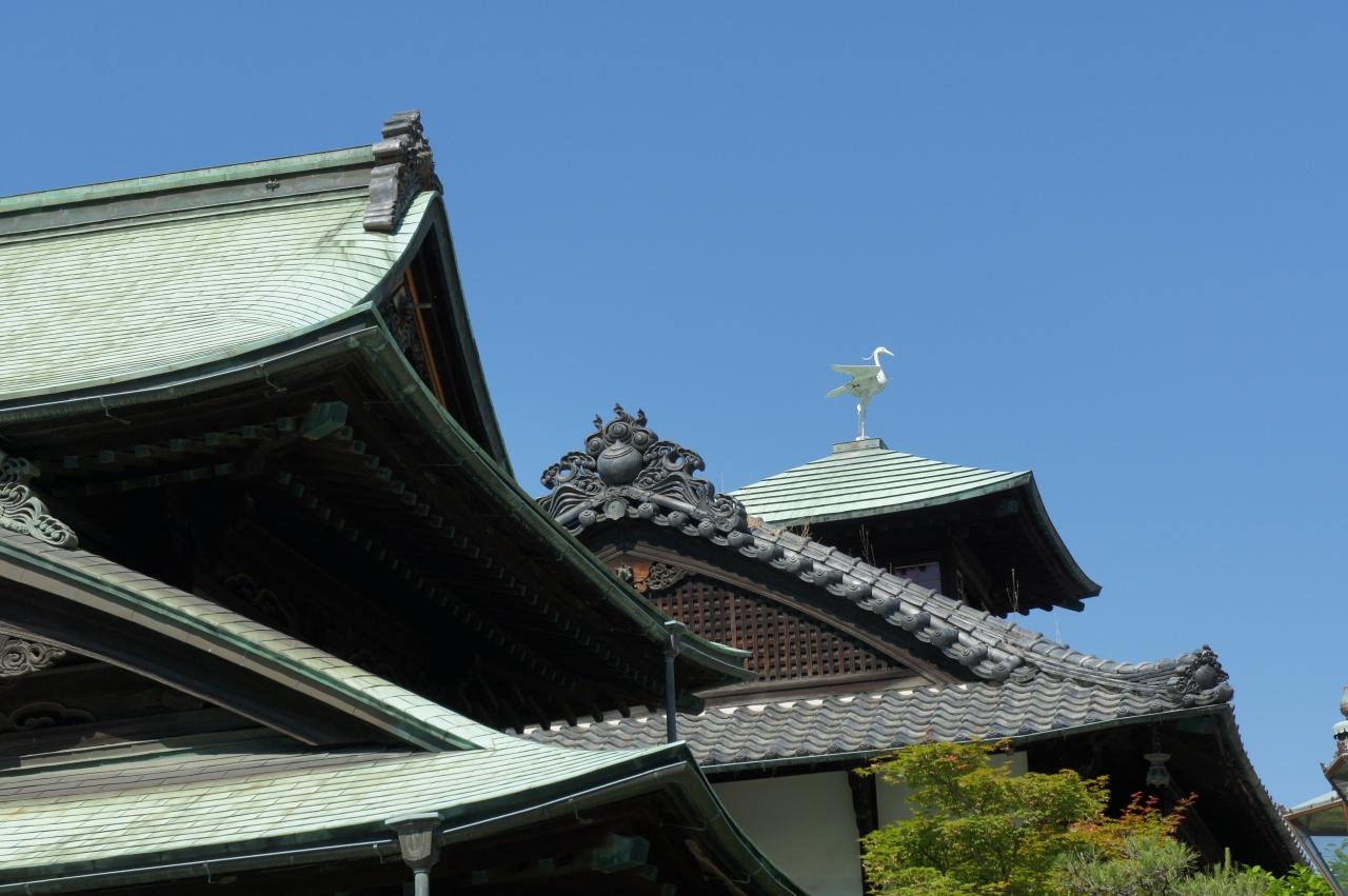 大屋根の中央にギヤマンを使用した塔屋(振鷺閣)を載せ、その上には道後温泉ゆかりの白鷺が据えられています。