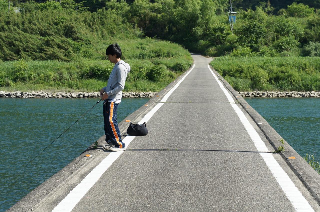 橋で腹這いになって釣りをしている子がいます(笑) -